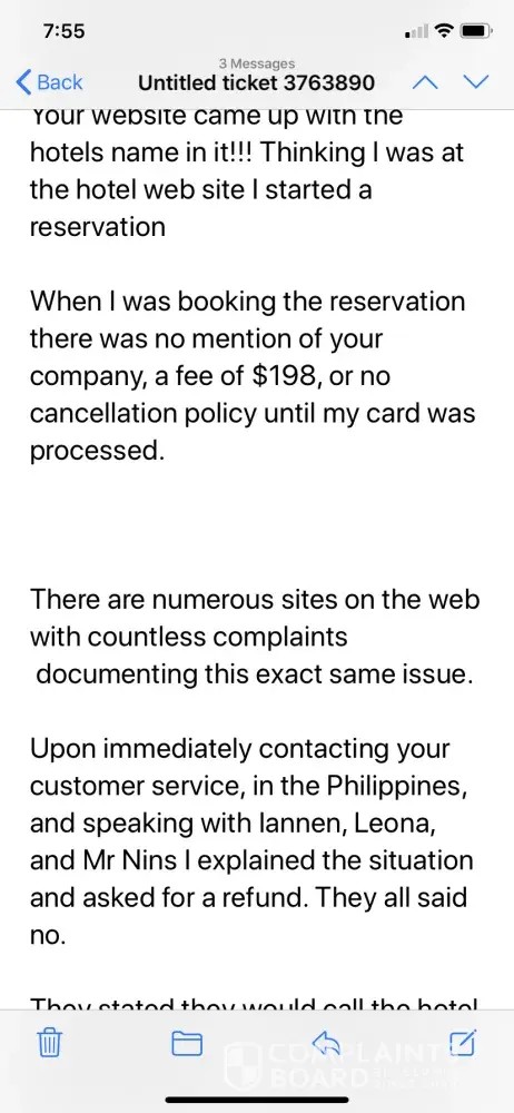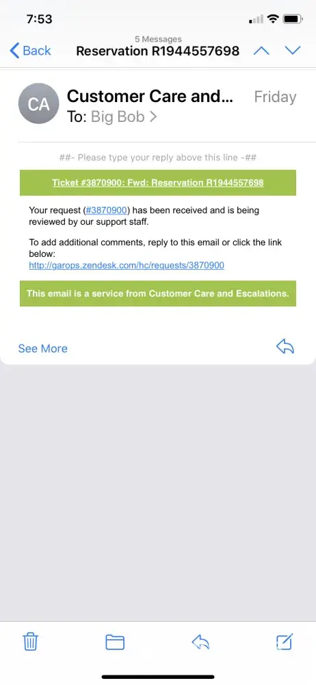I also sent requests to cancel through an email link in my original booking confirmation to their Customer Care and Escalations Zendesk site on 3/14, 3/17 and 3/21 and received a ticket number 3653589, but no follow up from the company.