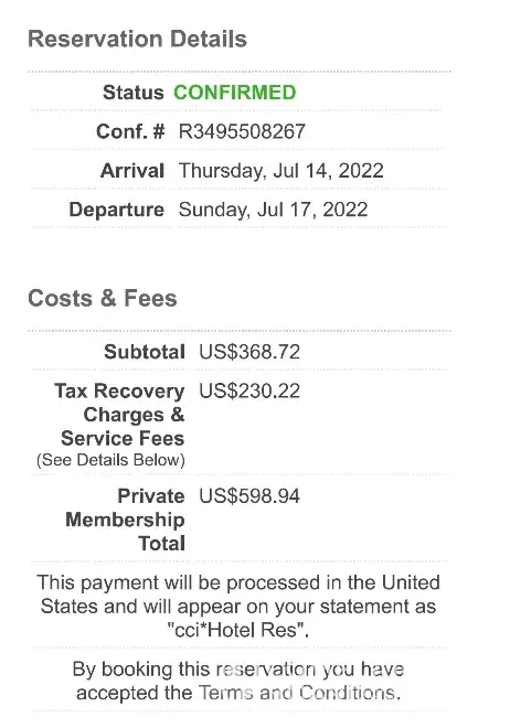 A room with a queen bed for 3 nights is $368.72. Taxes and service fees are $230.22, which I think is over-the-top. It says the taxes and service fees are explained below, but I'm not finding them. Don't know how much is taxes, how much is service fees? Then it says my reservation is non-refundable. I will never use this service again! Booking Ref. Number is [protected].