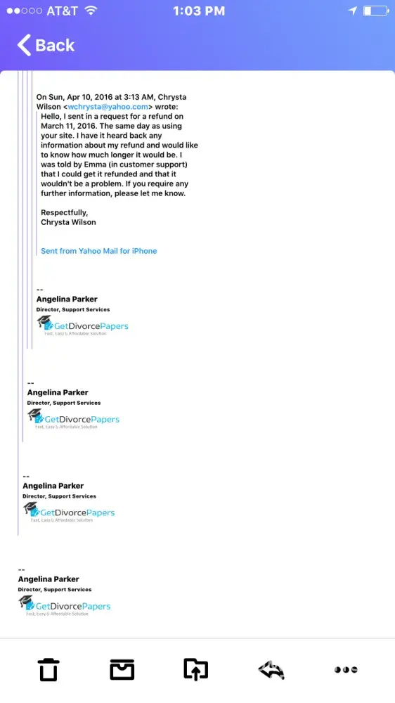 The divorce papers obtained from GetDivorcePapers.com were rejected from court. When emailed GetDivorcePapers.com regarding a refund [protected] Ticket Number 720995) I didn't receive a reply until I finally mentioned that I will file a consumer report. Angelina Parker, Director of Support Service, replied in one line "Please provide us with a copy of the packet you received and we will issue you a refund" [protected]). I sent the copy but I still did not get a refund or an email with an update. I wrote a final email today regarding the rejection of "Marital Settlement Agreement" by court.