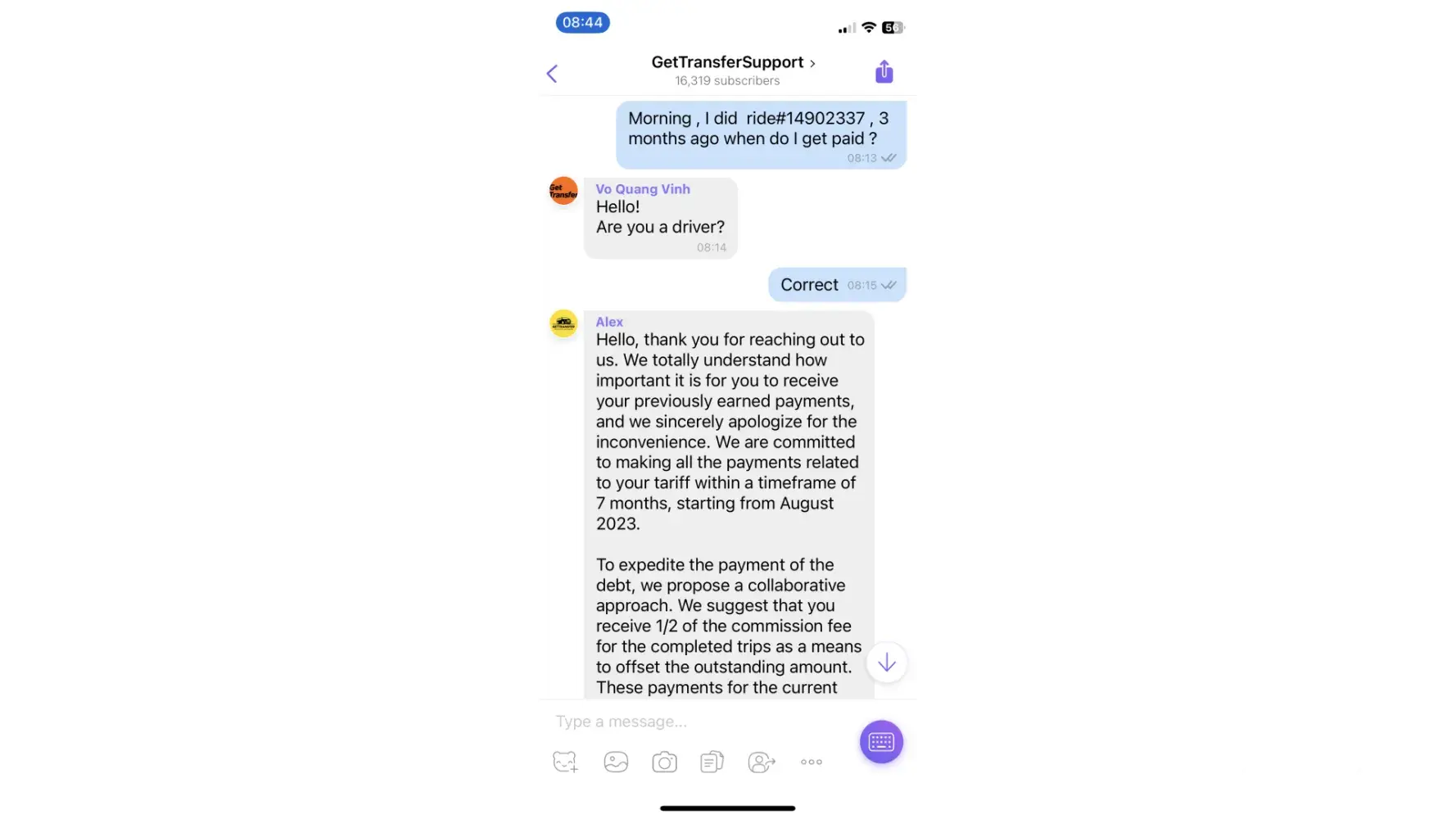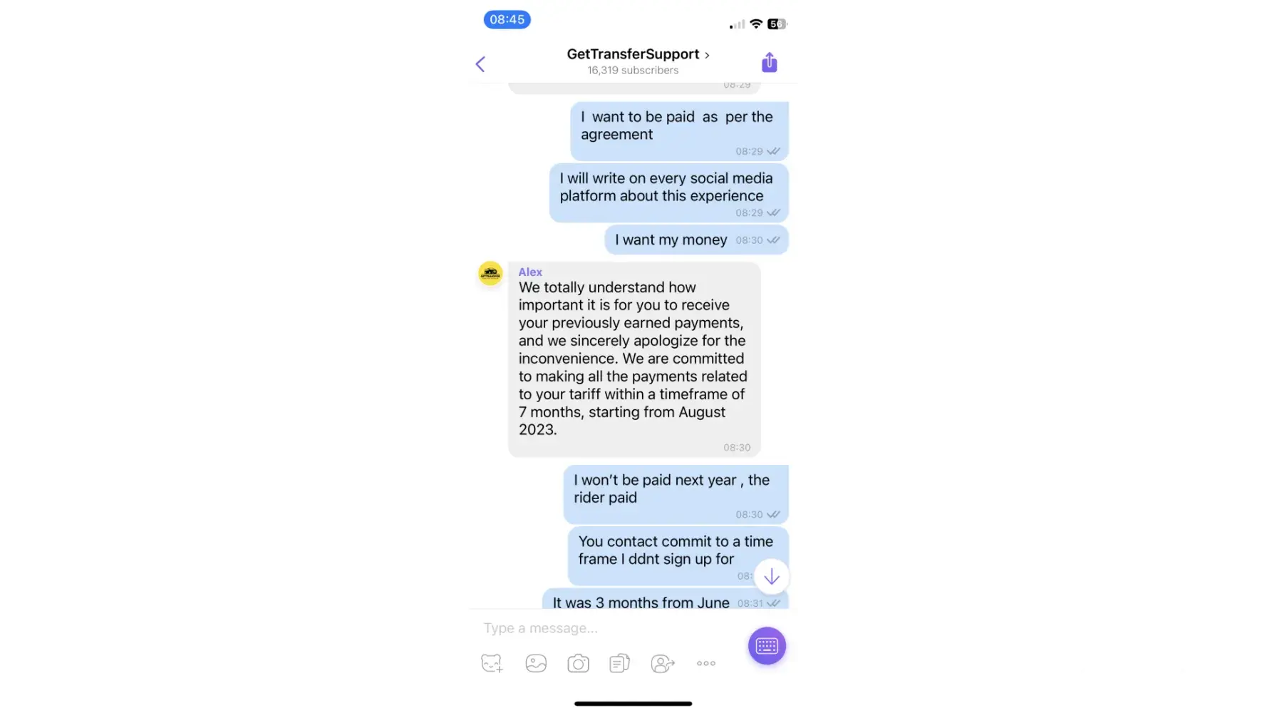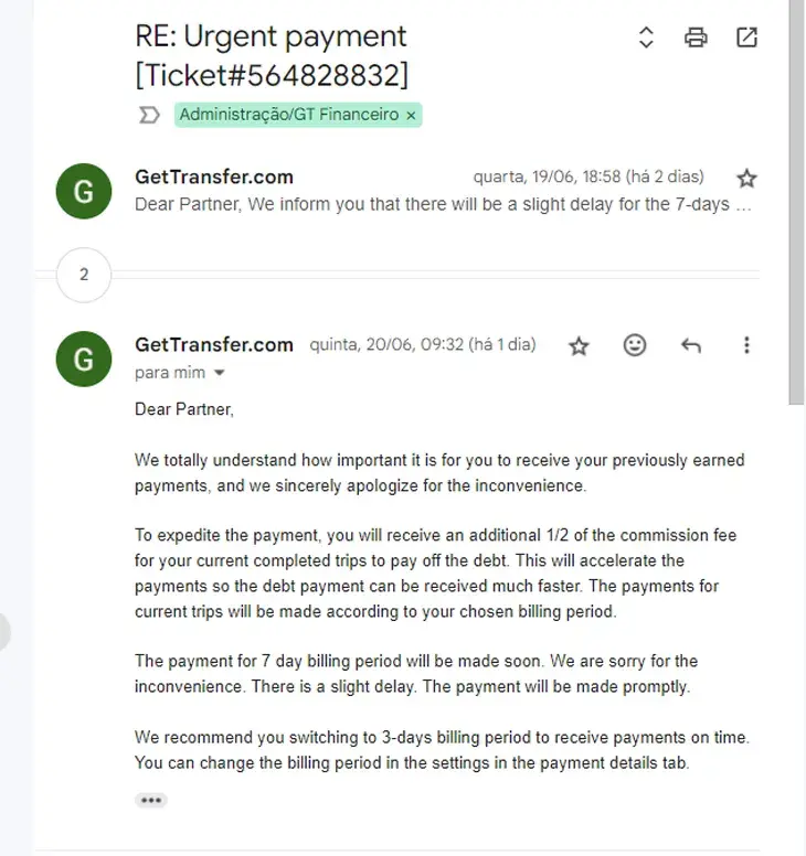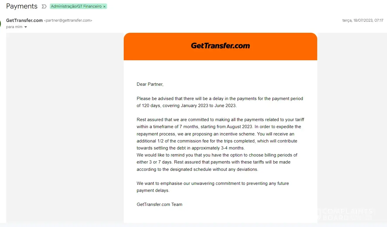 I registered with Get Transfer as a driver. The reporting period is 3 months. At the end of 3 months, I should receive compensation for my expenses and income from transporting passengers. The reporting period has ended, but I did not receive payments from Get Transfer. I only received letters from the Get Transfer company stating that they recognize the debt, but the terms of payment are unknown. throughout 2023, this company did not pay anything. The company receives 100% payment from the passenger and does not compensate the driver anything after that. The company sends letters with a request to continue cooperation and with a promise to compensate all costs. These are scammers.