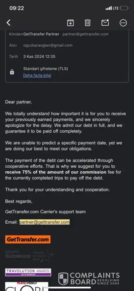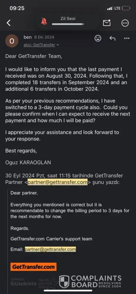I am a licensed VIP transport provider operating in Turkey (LAVION VIP Transfers), and I am reporting a serious non-payment issue with GetTransfer.com. Despite successfully completing many confirmed transfers between 17 August and 22 October 2025, GetTransfer has failed to pay the earnings for these jobs. All communication attempt...