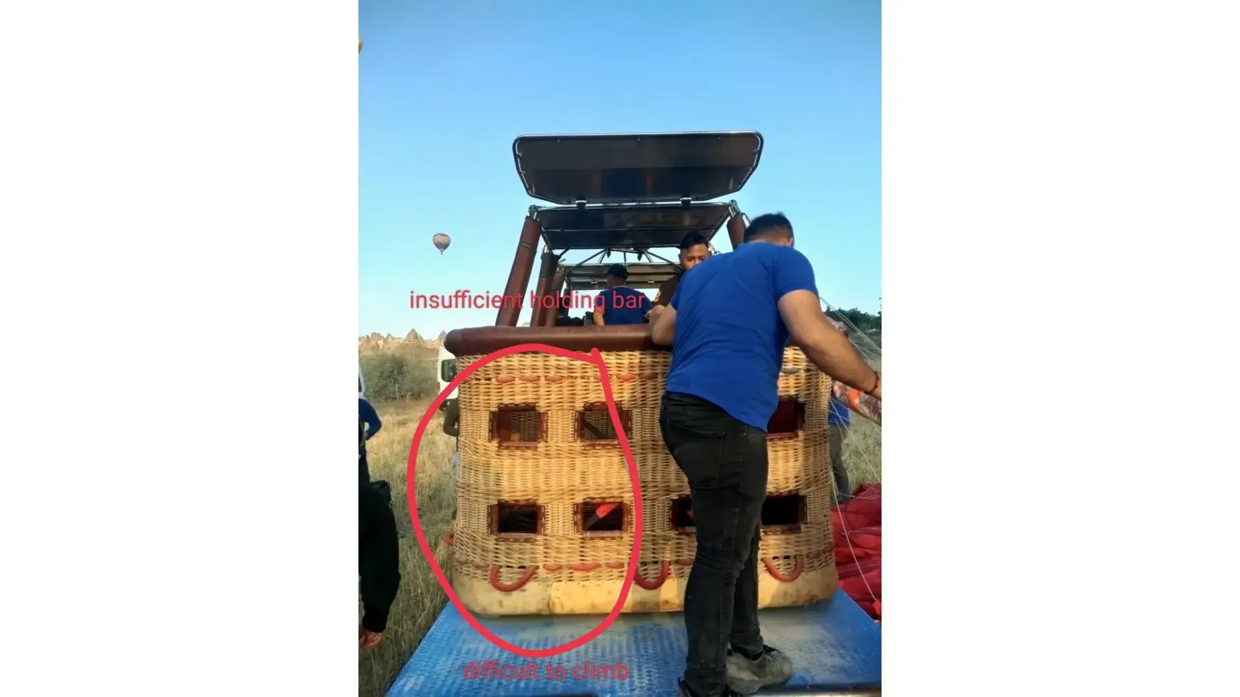 (b) insufficient holding bar in the basket. What if strong wind hit the balloon?