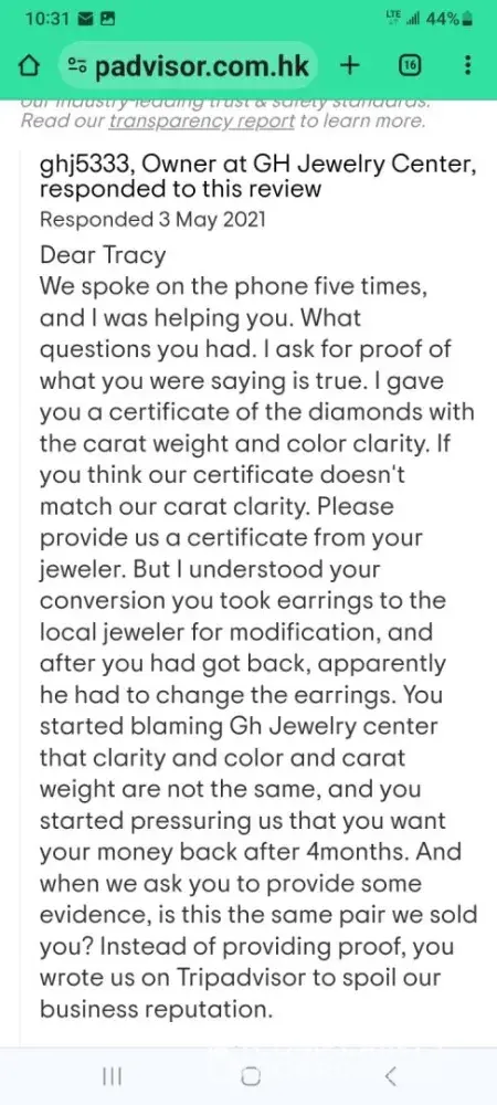 GH Jewelry Center is an honest and reputable business. A malicious individual posted this review intending to spoil GH Jewelry Center's reputation. We have thoroughly checked all our records, and we do not have any record of this customer.