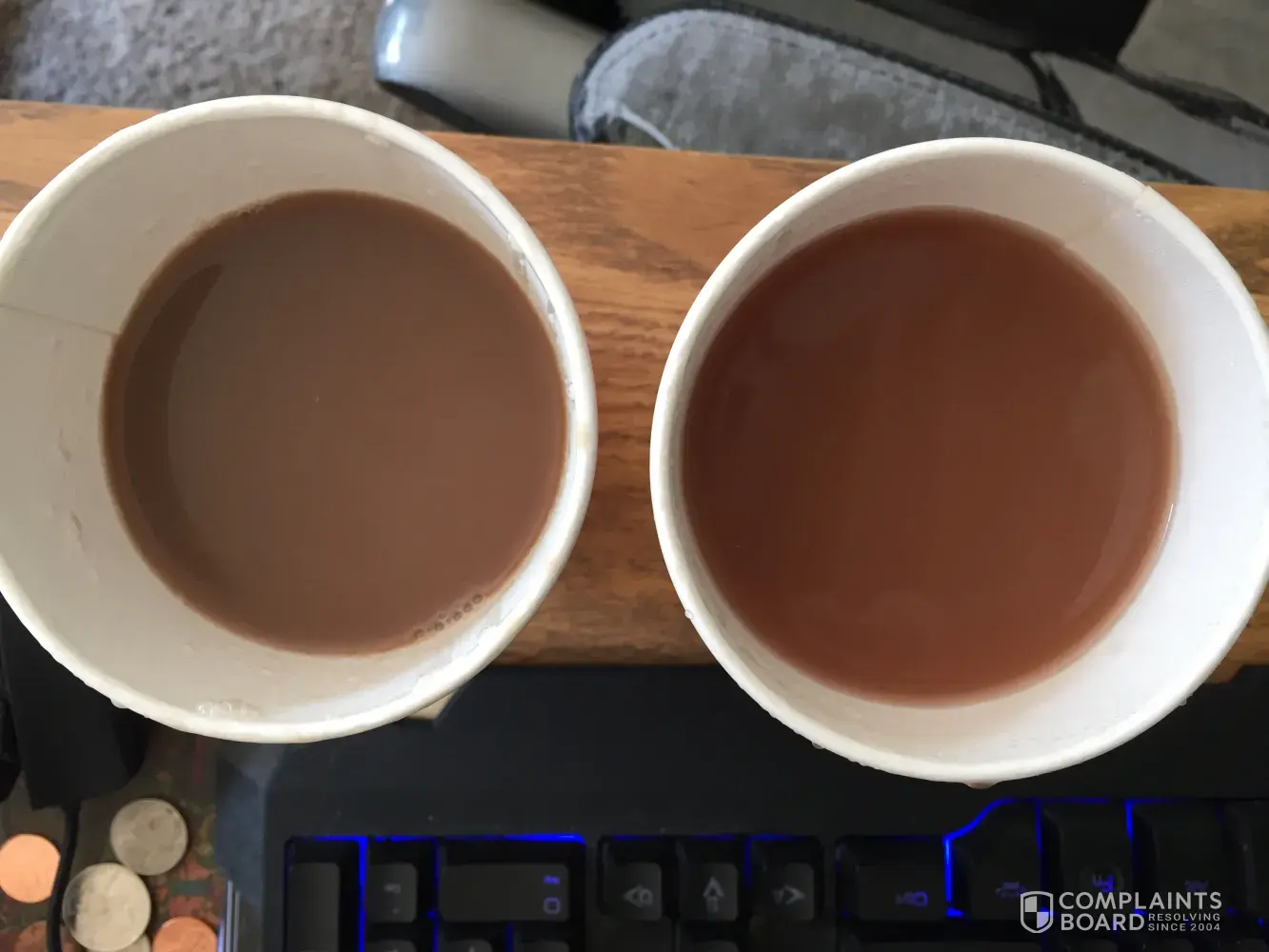 Store # 3514 in Pickerington, OH. I was getting a high energy mocha and the machine started off with normal dark coffee for a second or two, but then pure-looking water for the rest. I've gotten these before but never paid attention to how it looked coming out. Told a worker but they said that's normal. Had to wait for it to cool down to taste it and it did not taste right. Like slightly flavored water - pretty bad. I drove to a different GetGo 7 miles away that had coffee and got the same high energy mocha. Watched it come out and it was dark coffee-looking liquid the entire time it was coming out of the machine. And this one actually tasted good. See pictures (light brown was the good one, the darker redish one was the bad one from this store). Desirable resolution would be to ensure that the espresso machine at this location is fixed and running correctly. And a full refund of $1.69 for the drink and $1.00 for gas.