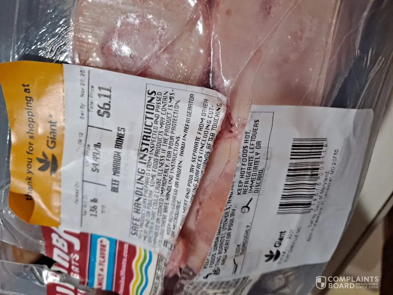 I purchased the bone marrow for broth on 11/12 11:22am and they were rotten. I have tried repeatedly to report from my giant account and it does not let me. My card # is [protected]. Don't have a car difficult to get a ride to your store. This is not the first time I've had quality issues.