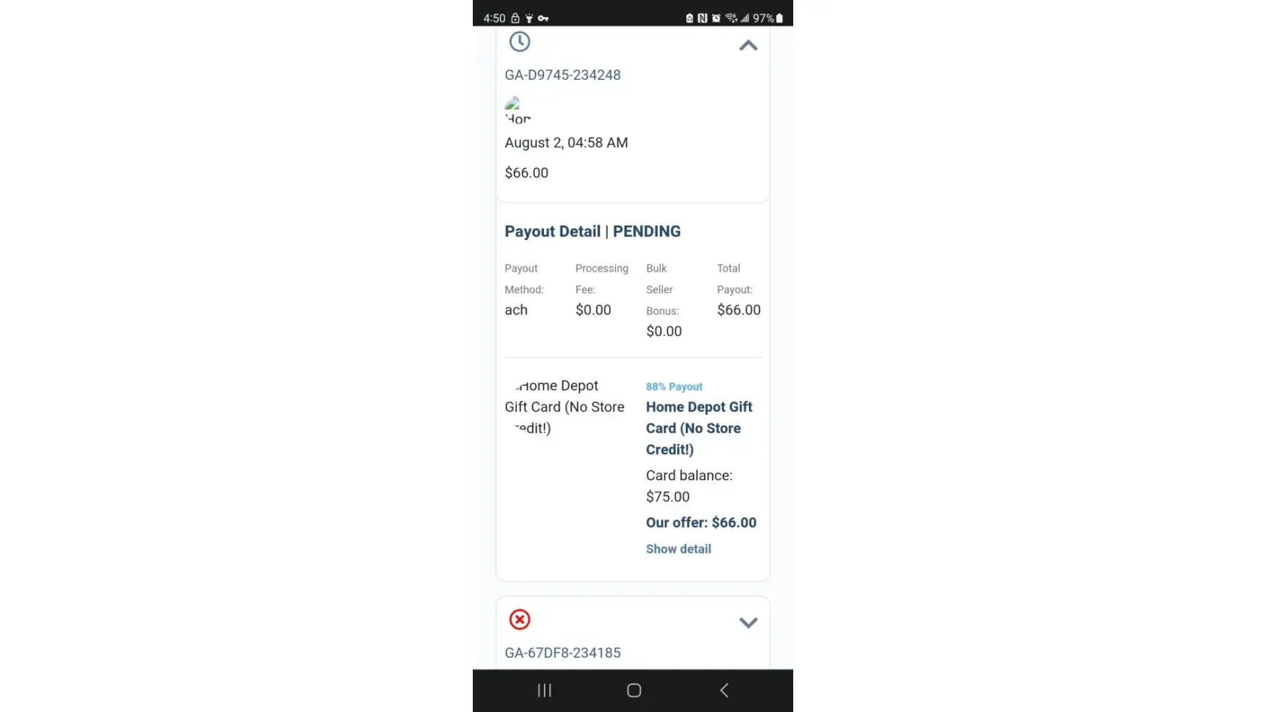 To make matters worse, I later discovered that my order had been canceled by Gift Cash, and I had not received any payout at all. My gift card balance was now at zero, and I had no idea when, or if, I would be receiving my money back.
