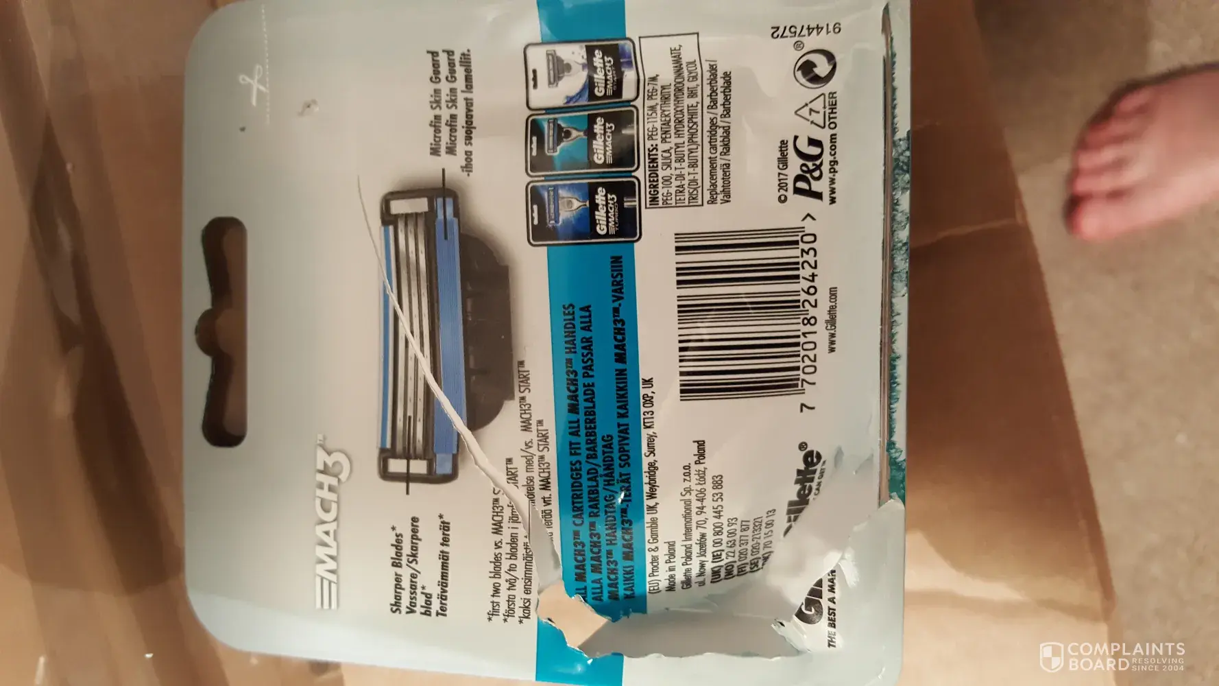 I tried to open a pack of Gillette Mach3 blades and couldn't get into it so I had to use a pair of scissors. It was still very difficult to get the packaging open even using scissors and caused me to njure myself as the scissors slipped through the packaging and cut the inside of my thumb. This was very painful and bled for some time. I'm concerned about this and also relieved I didn't use a knife as I feel I would have been seriously hurt. I think you should review the packaging on this item as i feel it it potentially dangerous.