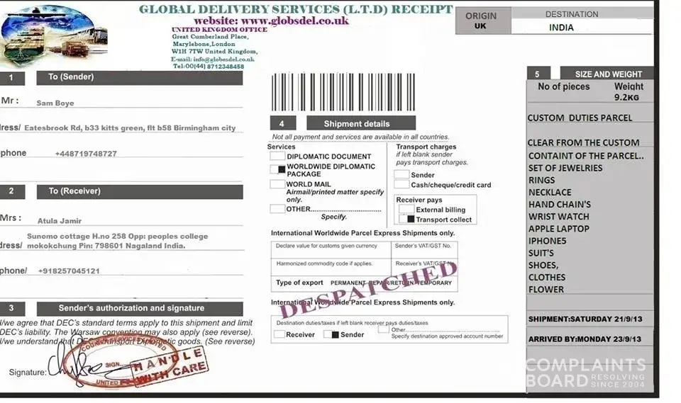 Do contact the GLOBAL COURIER DELIVERY SERVICES company with the contact information below for further instructions on how to send the consignment to your location and the amount to be charged for the delivery.