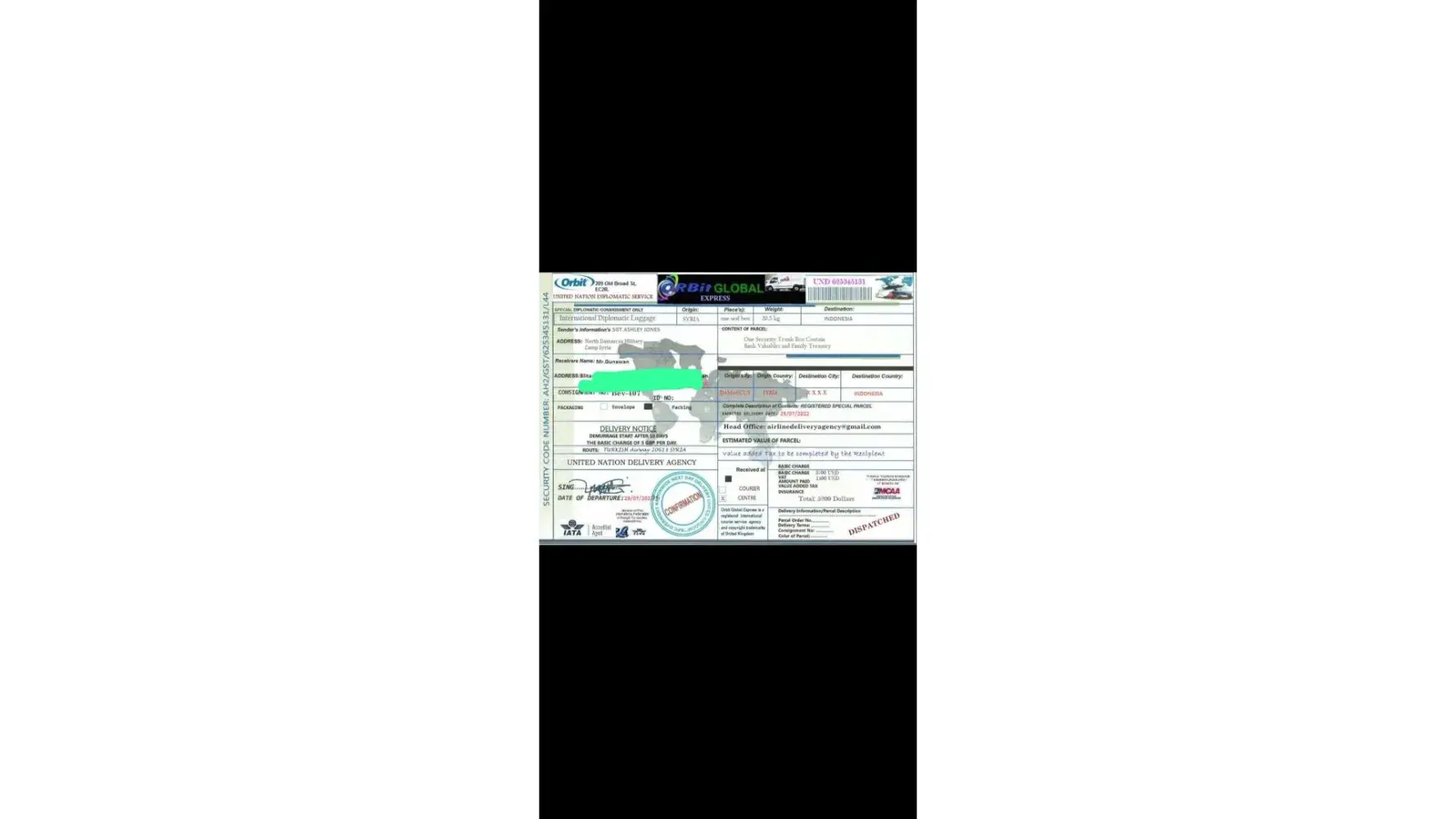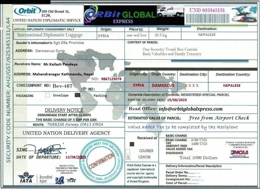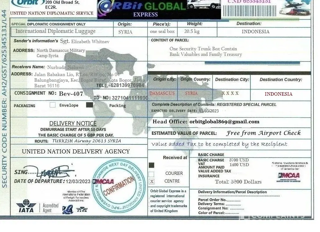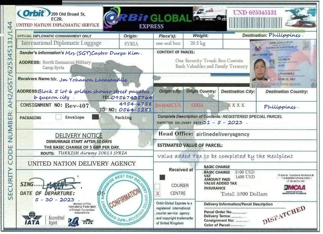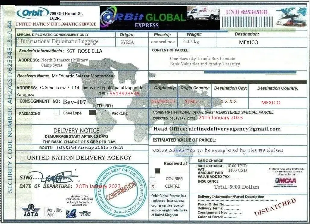 لقد ØªØØ¯Ø«Øª معى وقالت انها اسمي .. الرقيب ستايسي لوبيز .. أنا جندي أمريكي Ù…ÙˆØØ¯ أعمل كقوات ØÙظ سلام تابعة للأمم Ø§Ù„Ù…ØªØØ¯Ø© ÙÙŠ سوريا ØŒ ÙÙŠ Ø§Ù„ØØ±Ø¨ ضد الإرهاب وانها تريد ان تبعث لى بطرد Ùيه اموال تريد ان تعمل بها ÙÙ‰ بلدى وعليه Ùقط Ø¯ÙØ¹ مصاري٠الشØÙ† عندما تتصل بى الشركة وادركت انها نصابه وخصوصا عندما بعثت لى بوليسة الشØÙ† بتاريخ قديم ÙØ¹Ù…لت Ø¨ØØ« عنها وادركت ان Ù†ÙØ³ البوليسه Ø¨Ù†ÙØ³ الرقم لكن المرسل له مختل٠ÙÙ‰ كل مرة وهذة بوليسة الشØÙ† التى ارسلتها لى