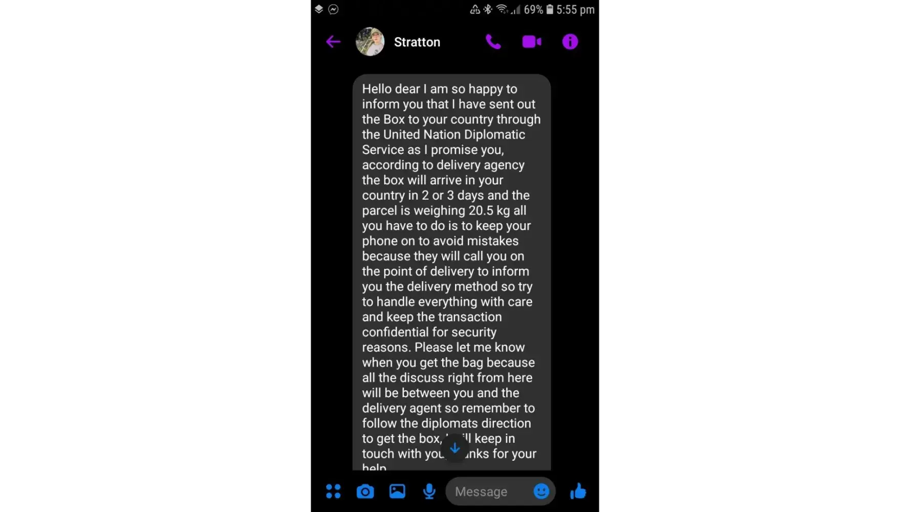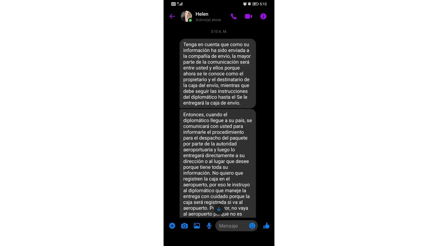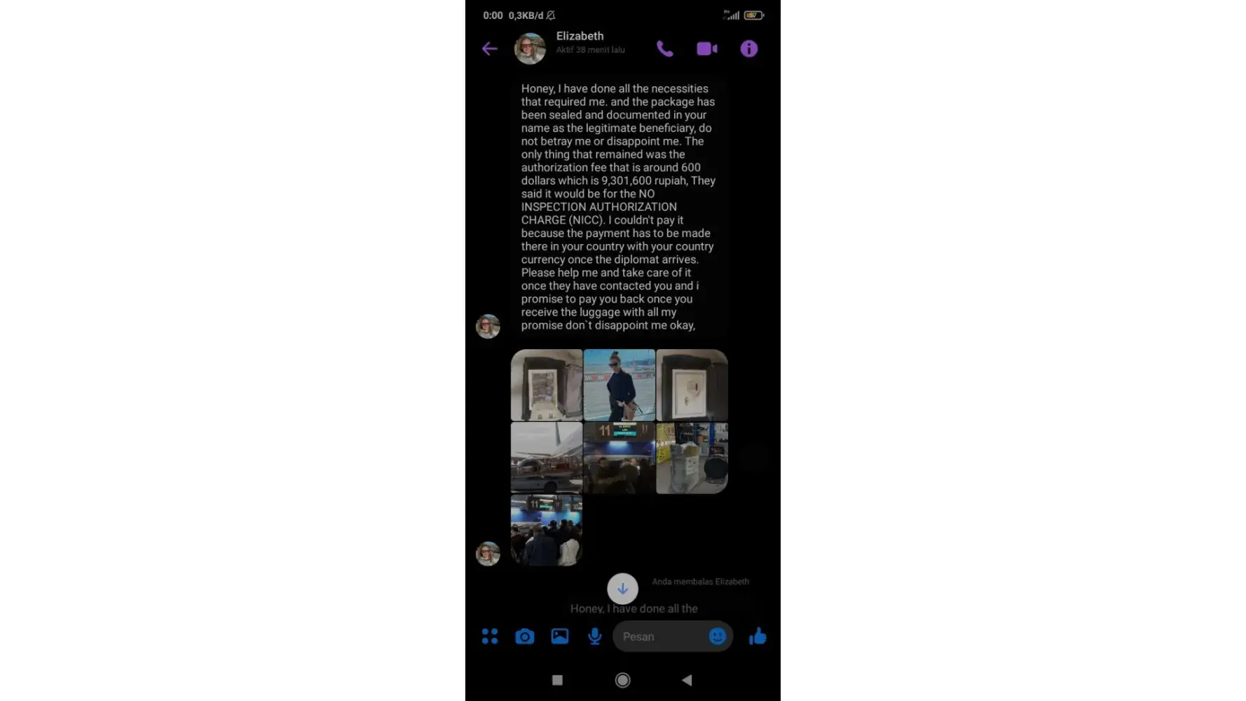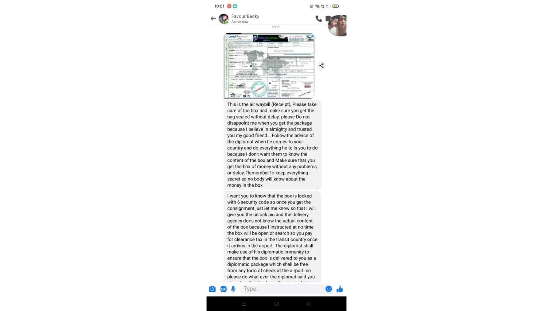 Ø§ØØ°Ø±Ùˆ من هده النصابة تدعي انها سترسل طردا Ùيه الكثير من الاموال من اجل الاسثثمار ÙÙŠ بلدي لكنها مجرد عملية نصب