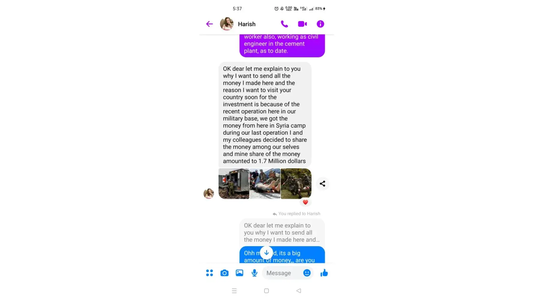 I can also chat with the messenger, he claims to be a soldier, the photo with you is a fake girl, sis