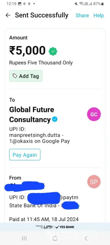 Hi All for my safety I am not posting my complete name because these Scammers can cause me harm as such i am justing putting my initials of first name, Please take time to know how i got scammed by Gurmeet from Global future consultancy. I'm here to request you all not to fall into this Global Future Consultancy trap located S.C.O 139 – 140, 2nd Cabin No. 207, 9-D, Chandigarh, 160009. Since 1 month a person named Gurmeet went on calling me convincing all possible ways and told me if I pay only 10000 Rs that's enough remaining consultancy fees which is 3.60 lacs will be deducted from my salary in installments after getting job in Canada or Newzealand. I have her call record which so clearly she said Mam you have to pay only 10 thousand nothing more than that. After you pay 10 thousand we will send you agreement form and offer letter just sign it. She convinced me to an extent saying Mam do you believe in Karma please trust me Mam if I cheat you Karma will not leave me, what will I gain in your 10 thousand blah blah blah all honesty talks she spoke. When I believed and made 10 thousand payment she sent my agreement which is now asking me to pay another 50K. I was so shocked reading the agreement. When I called her and said this is not right she never told me anything about 50 thousand she told only 10 thousand was the amount I had to pay and believing her I paid . I told her if she would have told me about that 50 thousand rupees I would have never sent her that 10 thousand. But now she is talking rudely and so dishonesty behaviour that she is denying the truth. She is saying she never gave false promises. I have full call record proof in which she said nothing to be paid more than 10 thousand rupees. I felt do disheartened that how can people cheat so easily. What kind of dirty parents dirty upbringing is that?. How are this Manpreet singhs and Gurmeet parents and family eating food earned by their daughters cheating with public money. Will such people's family live a healthy life cheating publics money? And now she says her Madam her boss Manpreet Singh is responsible for all this. Says that Manpreet is busy. I sent that Manpreet Singh 10 thousand on 18th July 5000Rs and 20th July 5000Rs please check the screen shots attached of payments made. It's so painful to lose your hard earned money to such scammers. I hope really police take action on this Gurmeet who along with her boss Manpreet Singh cheated me. I really Karma punishes both these people severly. I really ask God to return 10 fold pain loss to this Manpreet Singh and Gurmeet parents, children and family only then they will understand how it feels to get cheated and live on others hard earned money.
