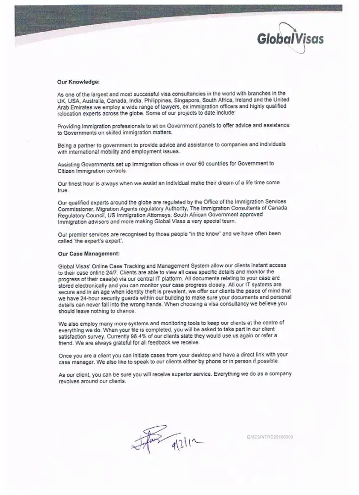 On 16 March, 2013 I stopped GLOBAL VISAS for all the services and hard work which they are providing me from last 4 months as I was totally disappointed. I just asked my case worker about refund policy as I didn’t receive any written agreement and next day she sent me an email regarding to the ‘UNSUCCESSFUL REFUND’ according to the terms and conditions of FAKE CLIENT CARE LETTER which GLOBAL VISAS got ticked by me FRAUDLENTLY.I initiated a written complaint to them as I am unable to speak or see personally any manager or directors, they don’t allow me and they have taken all the payments which is mis- sold of their fake services and fraud on the name of immigration. I got same response as ‘according to client care letter, they have provided me all the services’ and my account is closed.