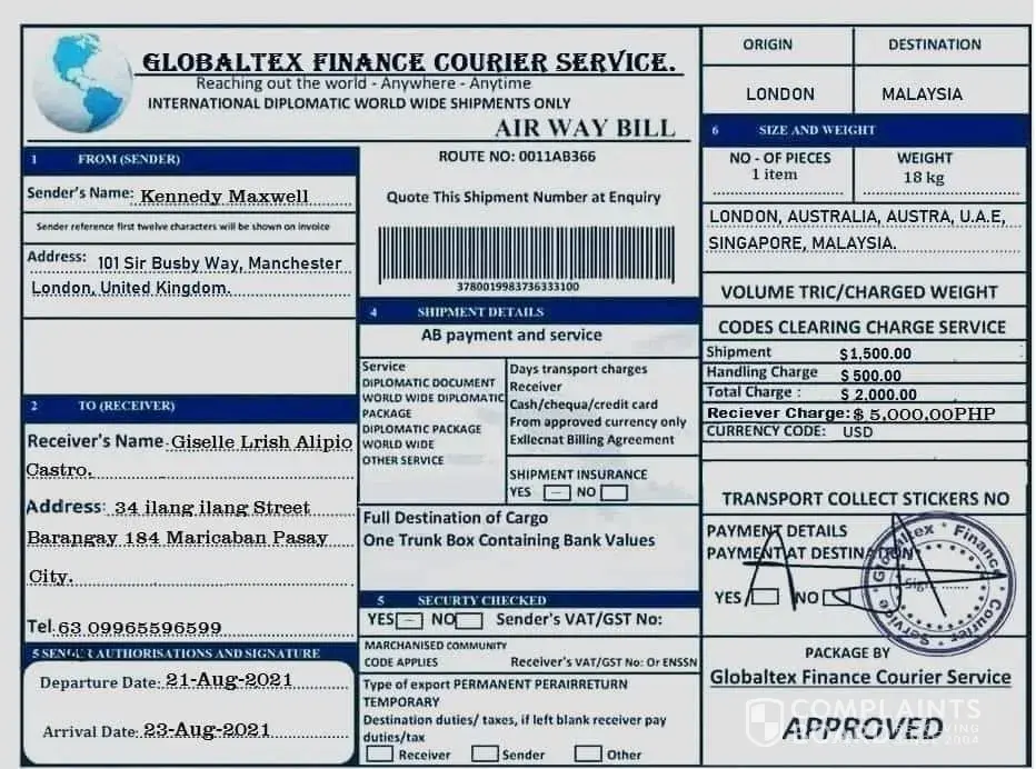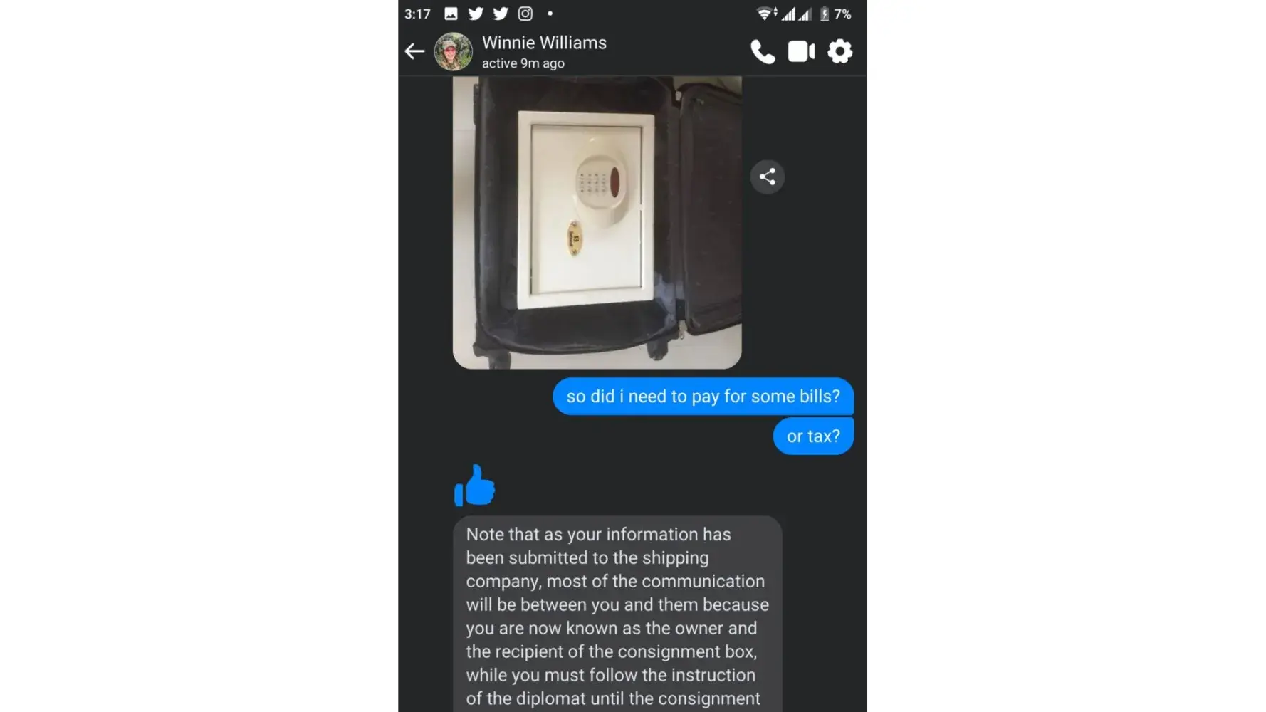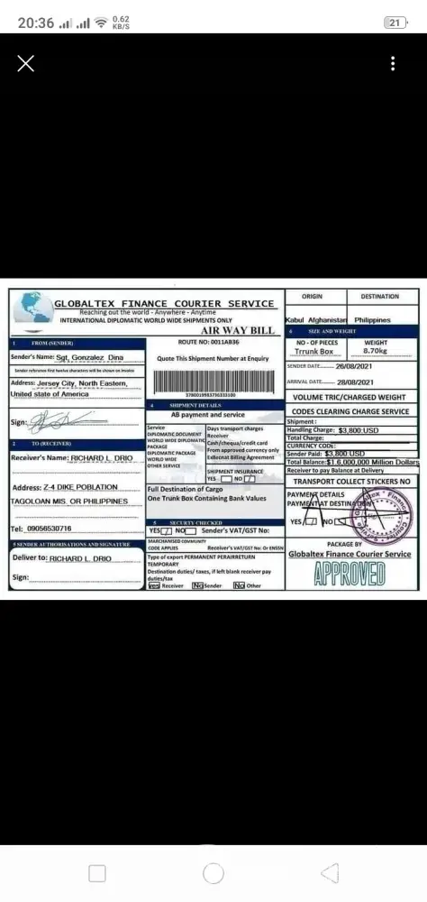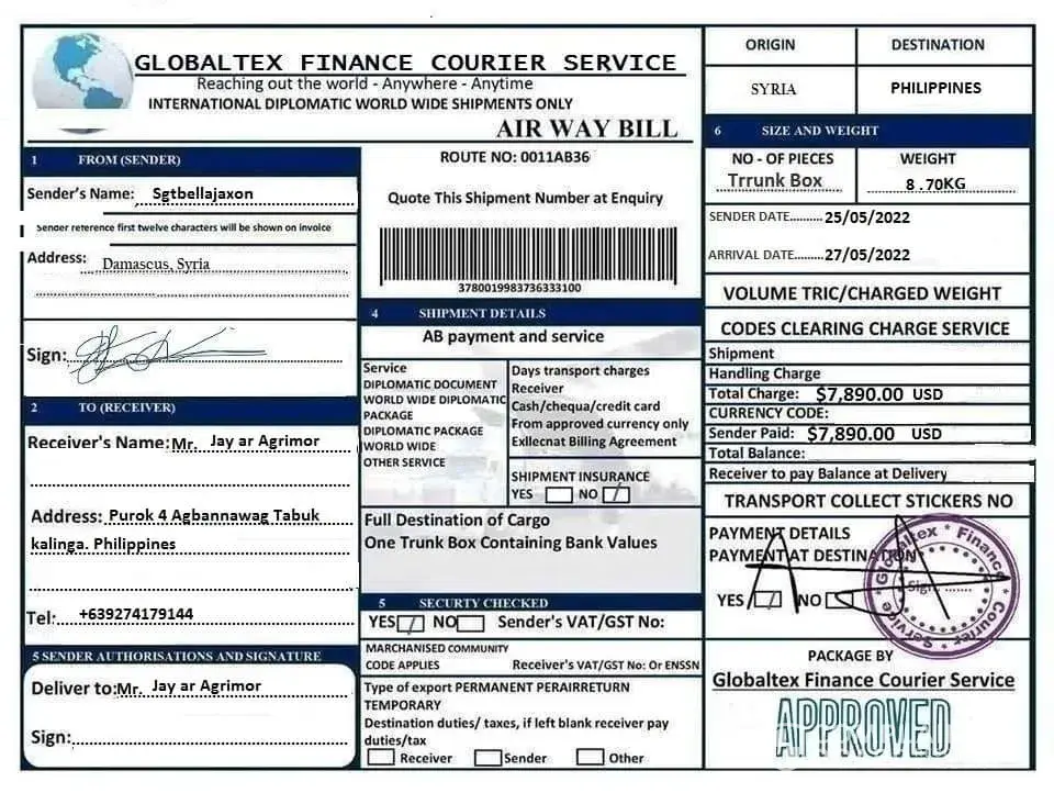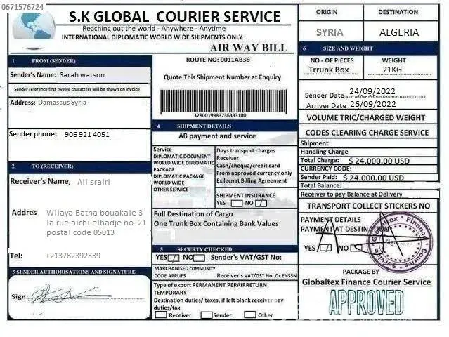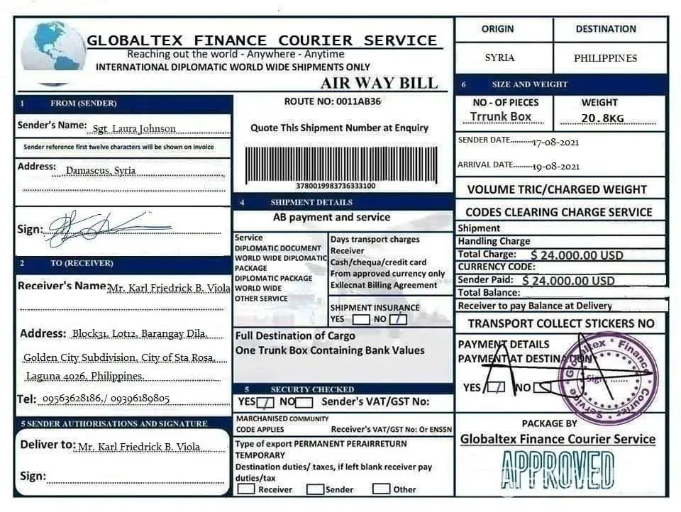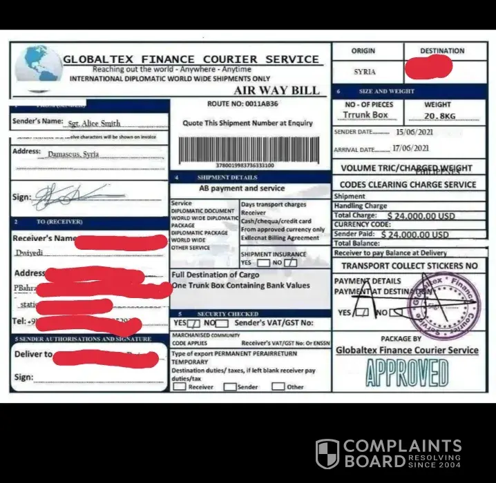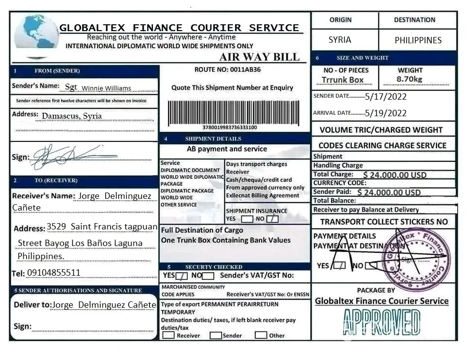 parehas po tayo ako din po na scam worth 100k nang hihingi po siya ng tulong form Damascus syria din po siya sgt winnie williaams po namen niya from us army nures po siya baka po same tayo ng story na sinabe na galing daw po siya ng ampunan and may nakuha daw po silang pera na pinag hatihatian nilang lahat na 2.7M dollar naawa po ako tinulungan ko po siya after that sinend niya na yung box after 2days nag simula na yung pag scam niya una humingi siyang clerance daw yon 50k kase di daw full pay then i ask the williams sabe niya babayaran niya daw pag uwi niya kase ayaw niya bigay yung code nung safe baka daw takbuhan ko siya after non tumawag ulet yung globaltex na need daw ng 25k para di haraning sa custom tas kinabukas tumawag ulet yung globaltex need daw ulet ng 25k para sa delivery after non binolock na ko nung Williams na scamer the fu*k nag loan ako at umutang para matulungan yung hayop na scamer.