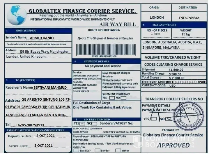Saya mendapat paket dari seorang pria di UK, dan saya harus membayar uang sejumlah $2.316, 23 agar paket diantar kerumah saya dan jasa pengiriman meminta uang lagi ke saya sebesar$701, 89 agar paket saya sampai kerumah. Tolong anda menjawabnya ku mohon ..