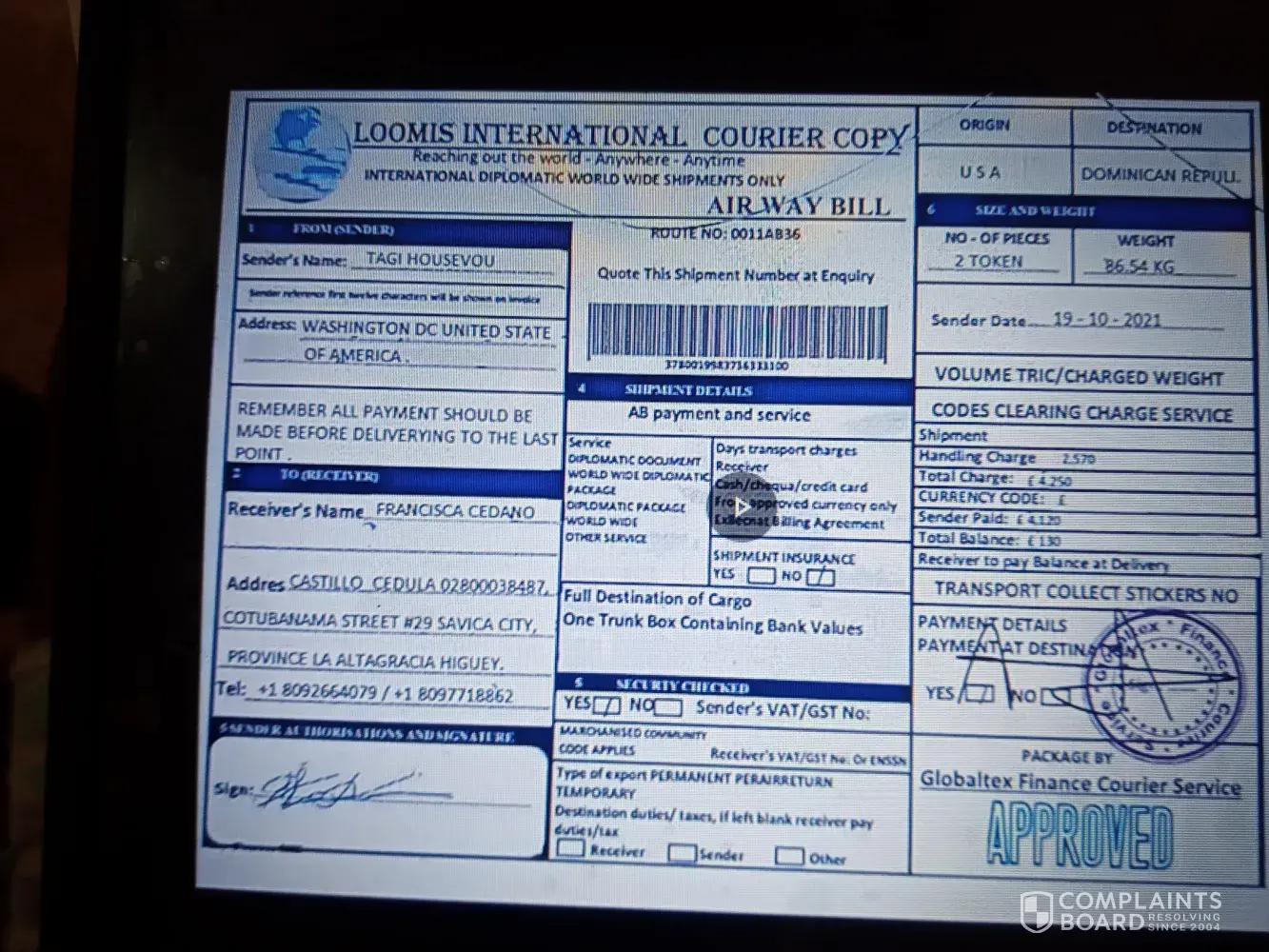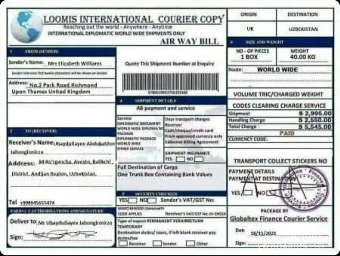 Why not send the box without anything the receiver to pay for? if it legit why agent ask money for the one who receiveth? I am just curious about... I smell like fishy! some kind of froud. inside the box some kind of huge of money... but cannot afford and shoulder to pay it all... wow! an amazing cript of craft and scratch! tell it to the marines!