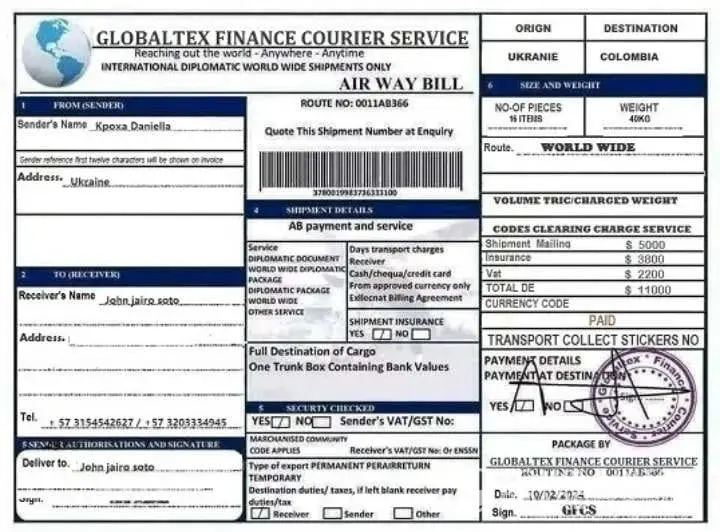 It's scam, it is the same signature I have with the parcel sent to me but of diferent name on it.