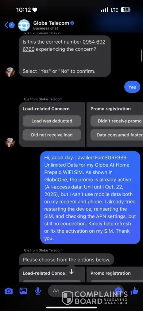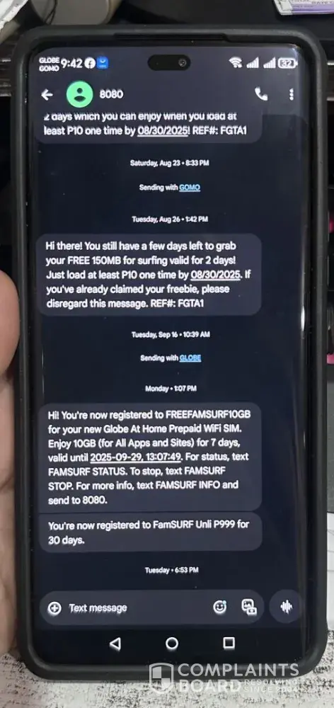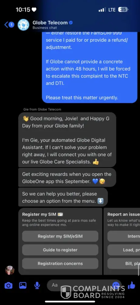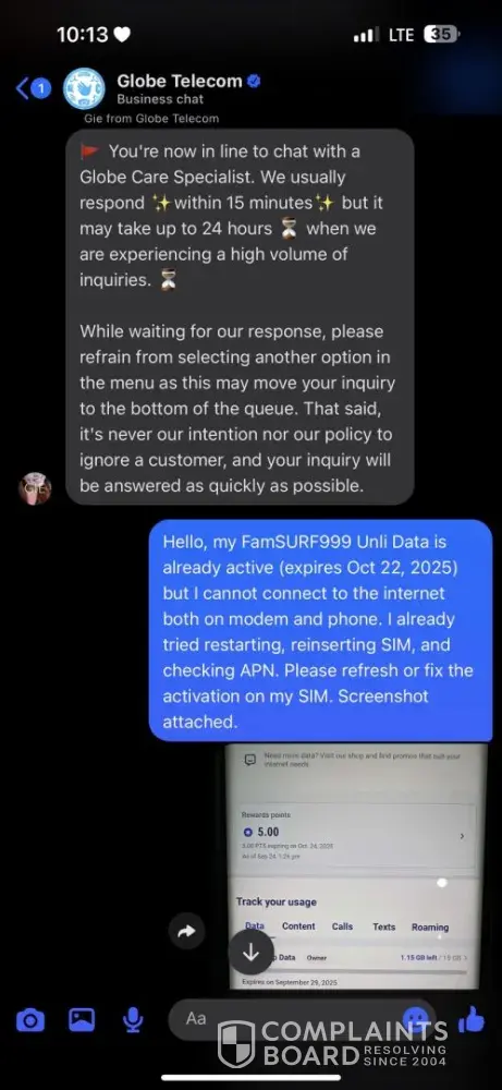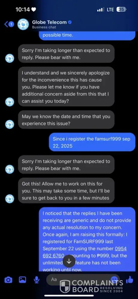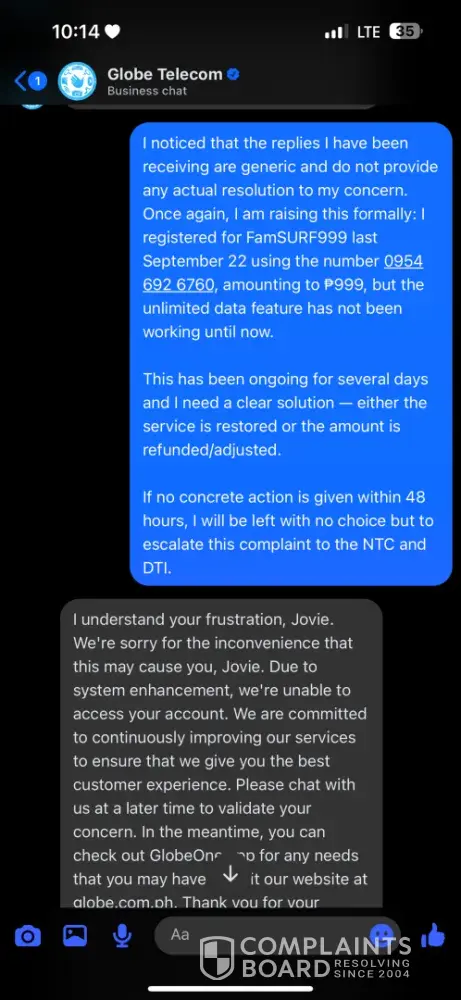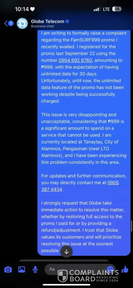 Good day, I would like to file a formal complaint against Globe Telecom regarding their FamSURF999 promo. On September 22, 2025, I registered for FamSURF999 using the number [protected], amounting to ₱999. The promo should provide unlimited data for 30 days, but until now, the unlimited data has not been working despite being successfully charged. I...