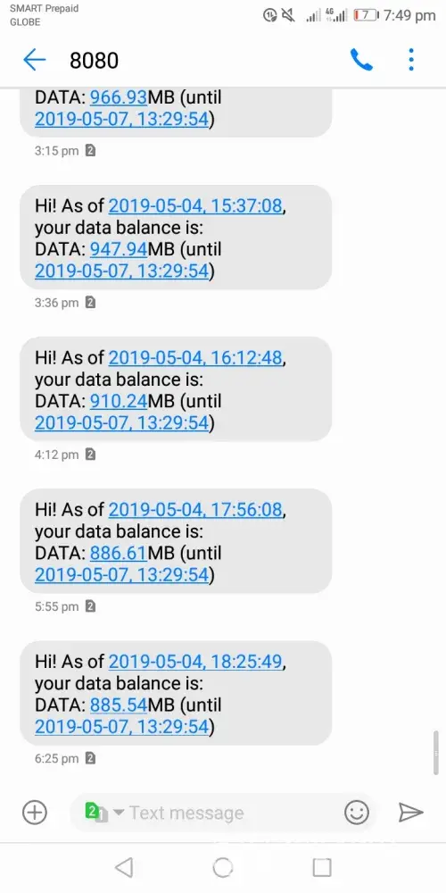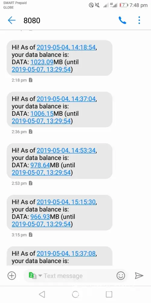 Firstly, I bought a load yesterday thru my gcash account and this was the output :*(P20.00 prepaid credits was loaded to ur mobile# [protected]. Trace No: [protected] 05/04/2019 08:31PM.) But then when i check the balance this is the result*(Hi! Your load balance as of 05/04/2019 08:39 PM is 0.50, valid till 05/03/2020 08:32 PM. You have 0 texts to all networks. Thanks!).