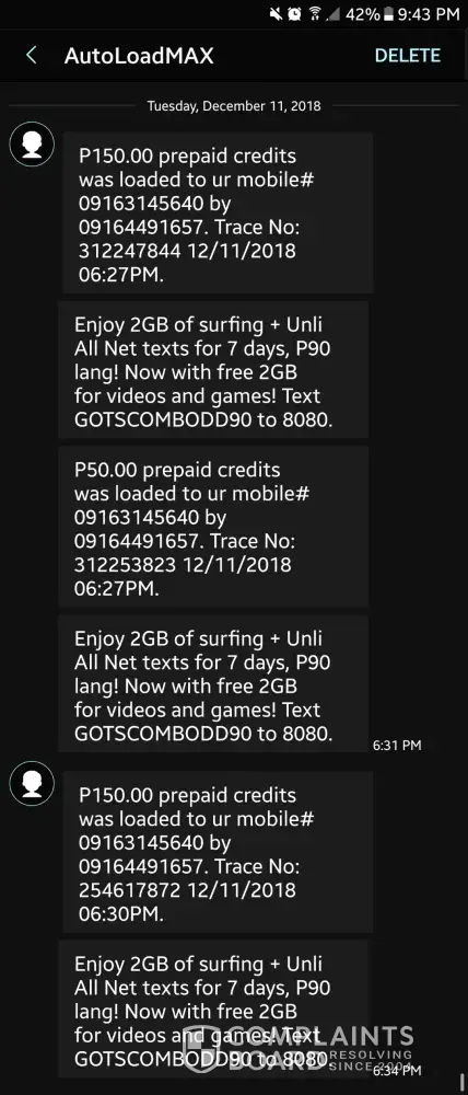 I bought two (2) Php150.00 load and one (1) Php50.00. I received a confirmation from GLOBE that P150, P150, and P50 was loaded in my number, [protected]. HOWEVER, when I tried to register under the GOUNLI350, 8080 kept texting me that my balance is not SUFFICIENT. When I checked the balance, only Php150 was reflected in my load balance. PLEASE GIVE ME MY PHP200.00 worth of load. I have suffered enough inconvenience.