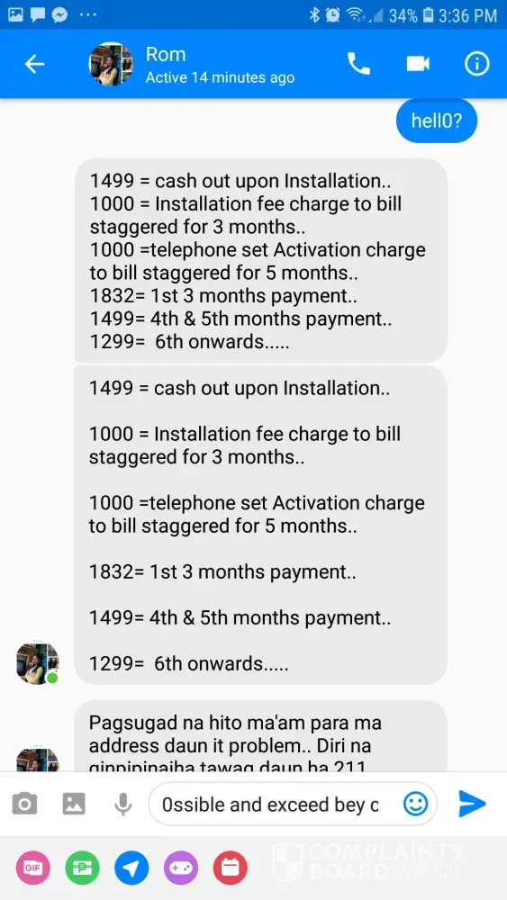 On September 17, 2018 I contracted with you for Plan 1899. 2 weeks before that, I have been contacting and exchanging calls with ROMY PAGASPAS, your team leader assigned in our area. ROMY PAGASPAS, the team leader, S. VASQUEZ and J. GARAY the installers were the people I spoke to when they are installing my plan at our house. I entered into the contract on the basis of being provided with estimated speeds of 15mbps. I have attached the receipt of the cash advance of P1899 that I paid for. Please see for your reference. I also gave extra to the installers and the team leader for their effort on that day.
