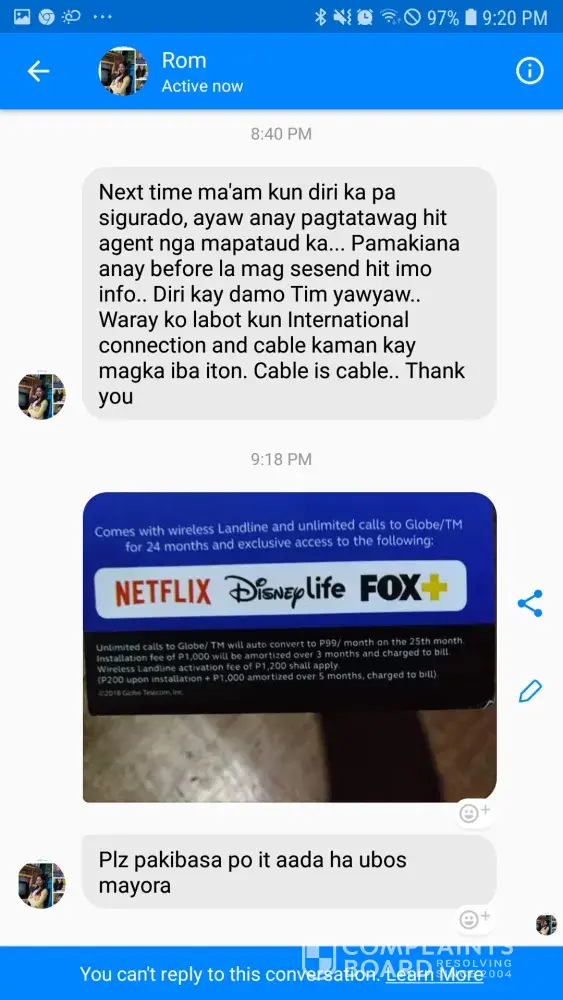 Bottomline: Globe would rather have you terminate your business with them for nearly 2 decades than to resolve your issue. Honestly, I am relieved that I no longer have to endure this incompetence on a monthly basis. Good riddance.
