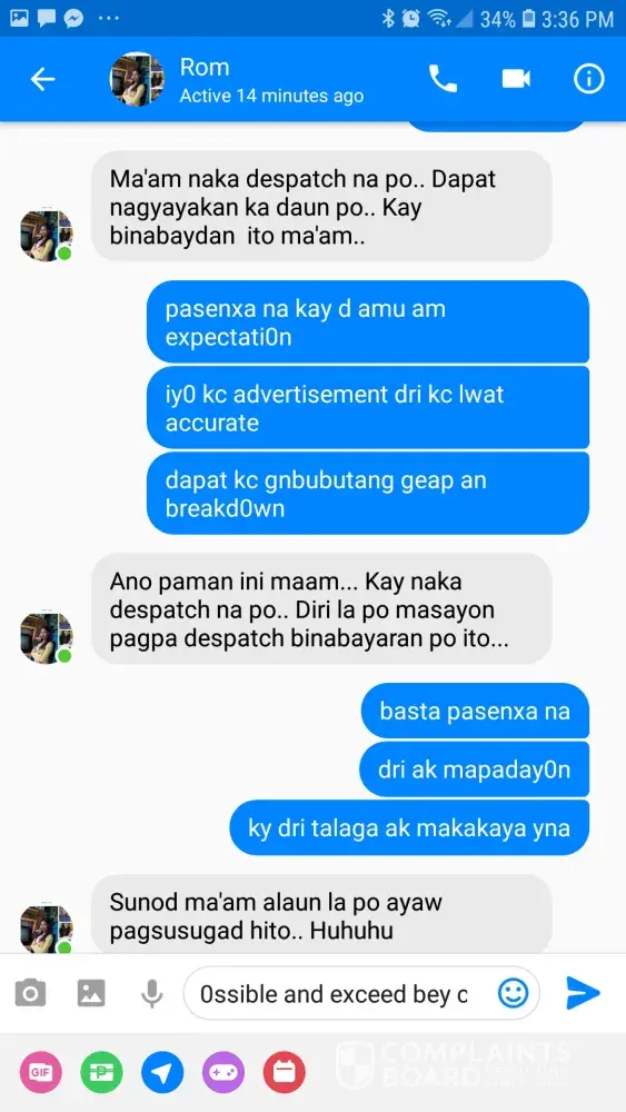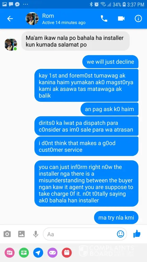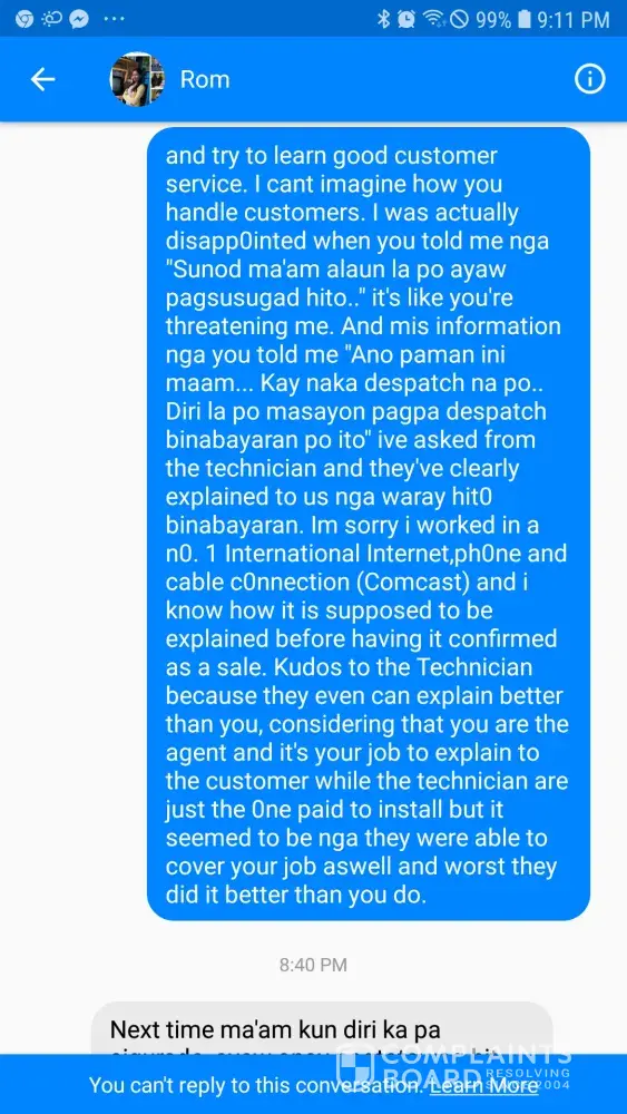 I have established to my satisfaction that the problem is beyond my control, and that you are not providing the service I am going to pay for. ROMY PAGASPAS is not updating me regarding the matter. I want him and the installers to fix what they have done because it really is a hassle to me because I am a mother of two and I work online, so it is essential that I have internet that is functional. I request you again to send someone from your office to check my connection. I expect a quick response as satisfying your customers should be your first priority.