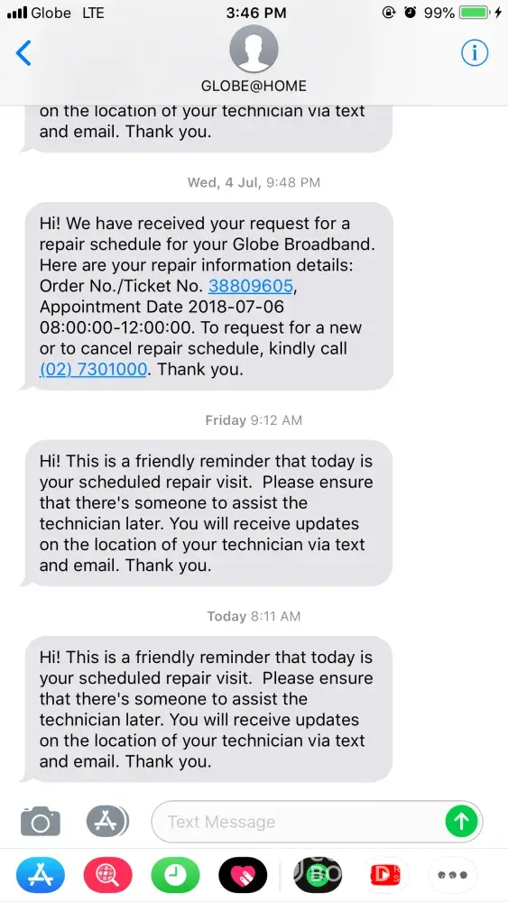 I would like to file a complaint against Globe of how encompetent they were in fixing my internet issues considering that my service is just 4months old yet I already have more or less 7 technicians. Last 5th of July, I had another technician visit and the technician just checked if I had a dial tone, went out, told me that they'll just check the main box and NEVER CAME BACK. I called the hotline again, and they rebooked my appointment, sadly, the technician just noted that I am not available where in fact, I took a leave of my work as I want to personally talk to the technicians regarding with the on going issue of my service. They rescheduled me again for today, I took a leave at work again, and the same thing happened- THE TECHNICIAN DIDNT CAME! And when I called the hotline all they can say is sorry and another assurance! If only I dont have a contract with them, I should have chosen another provider! Globe please, I am really frustrated of how you are providing your service! I dont care how encompetent your agents are, but please make sure that I am getting the service I am paying for!