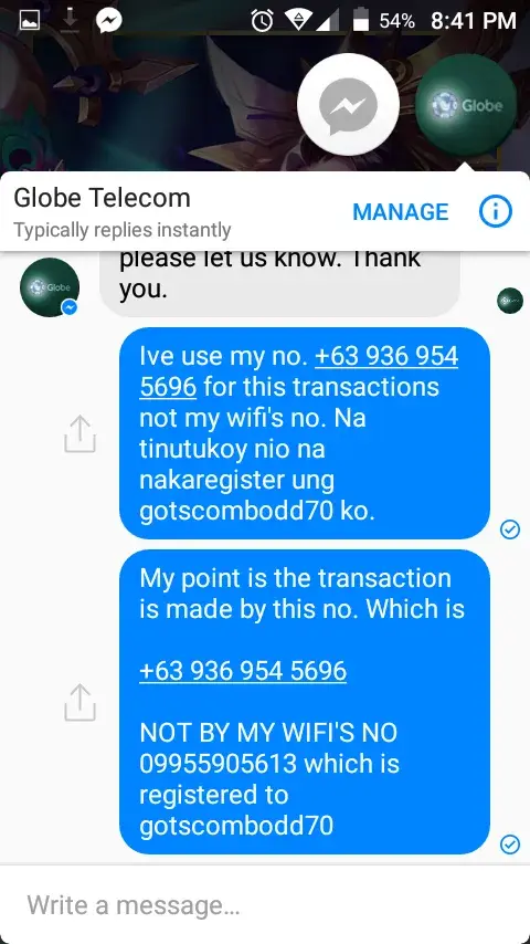 I explaine it slowly ha para maintindihan nio globe. The P66 wodth of load is from my wifi's no. ([protected]) i send it to my another no. Which is ([protected]). So i use the P66 pesos to buy Garena arena of valor voucher that is worth P56. Ive been charge by 3507 and says ive been charge by P62 na akala ko ay successful ung transaction. I wait for 24hrs for the voucher then i contacted Garena Arena of valor customer service and check my google playstore history which is DECLINED YUNG order ko so bakit ako na charge if hindi ko narecieve un item na binili ko pero wala na ung P62 load ko