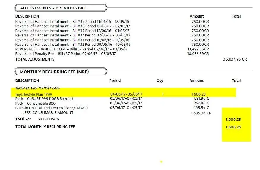 My contract with them ended August 19, 2016- then I renew it but they had wrong records and charged me with around 2600 (see attached) for early termination charged. I renewed and got Note7 in August and they told me that the early termination fee of 2600 will be reversed. But they recalled the phone. and then they tried to contact for replacement for a few times but they cant reach me and i did not get a call after. I have waited from october 2016 to early dec 2016 for my replacement but did not get any so I called them and they said that its okay if i file for termination since I did not get my phone. I bought a new one already. but my bill went so high as far as almost 36, 000 they said for early termination. They I called them and they reversed it, now I was left with almost 15, 000. Since early dec.2016 i did not use the sim card and finally I was able to successfully filed for termination on Jan 2017. then they processed it on April 2017. I am expecting to pay only my bill from Sept2016, oct2016, nov.2016 and dec2016 (1799 X 4 mos =7196) but i saw that I have to pay 15500 according to them. Hence they billed me from Jan2017 to april 2017 and the 2600 pre-termination fee before this new contract. I dont want to pay it because it wasnt not right. I filed another claims instead receive another bill that says my bill went up to 17500 .. I dont know who else to call to process this because I called them so many times and I had to wait for 45 mins more or less just to be accomodated.