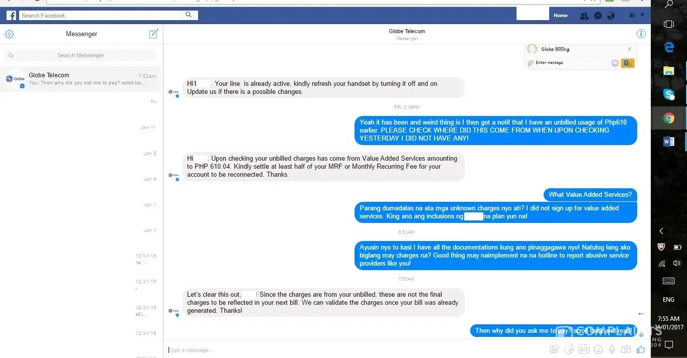 We are under plan 1599 and the package includes unlimited call to Globe and TM numbers. This all started January 12. We were trying to call a Globe number when the voice prompt started saying that we are restricted from doing so. Thinking that it'll be resolved by itself after few days, we ignored. Come January 14, we started experiencing flactuating internet connection which later on totally disappeared. Thinking again that it will be resolved by itself, we ignored.