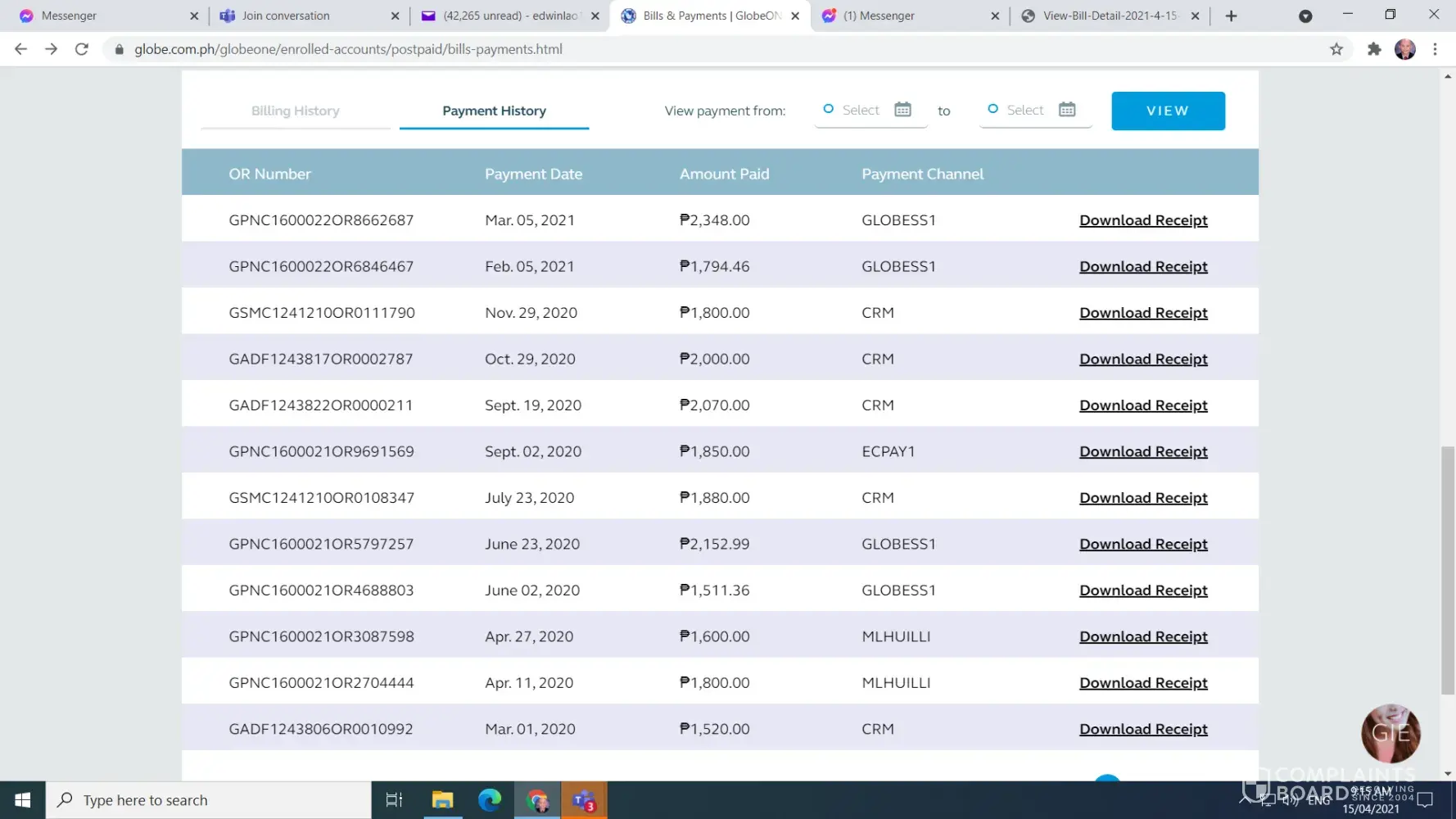 I made an online payment, GCASH, on my Globe account # [protected] last April 4, 2021. After paying online, a notification appeared that a payment receipt will be sent to my email address. Yet as of now, I have not received such receipt.