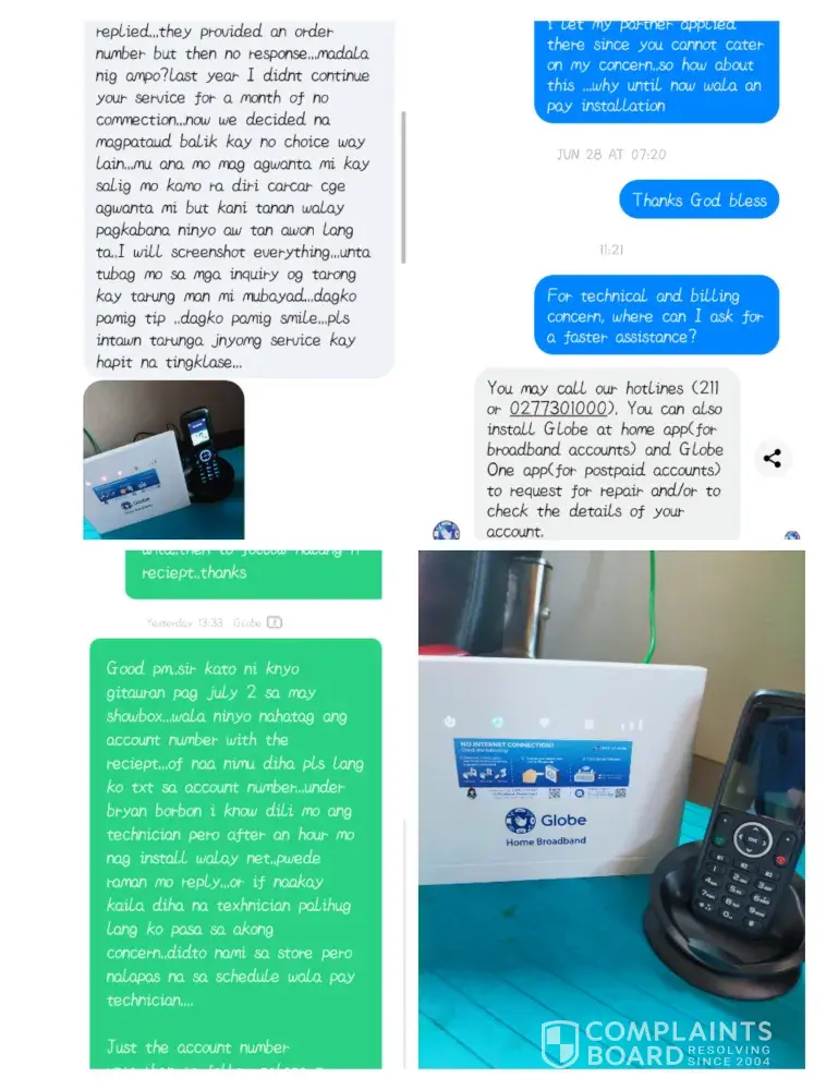 I am Pearlie Joy Mait Suarez and I am a subscriber of Globe's Globe at Home Broadband Plan 1899. My account no. is [protected]. We are experiencing lack of internet connection since July 07 (Tuesday) and I have requested for a technician for that and was assured that a technician will be sent on Wednesday (JULY 08). My reference no. for that is [protected]. However, there was no technician since Wednesday, Thursday, Friday, Saturday and Sunday. I keep on calling their customer hotline but my call can't go through until today (MONDAY, JULY 13). It was today that I was informed that my request was not elevated to the proper department so it was as if there was no request filed and this was due to the fault of the customer service representative. And so I filed another request with reference no. [protected]. I was shocked this afternoon that i received a text from Globe saying that they have resolved my problem but actually there was still no technician and we don't have internet connection still! Please help meeeeeee. Globe is very hard to contact. Even in their messenger and facebook page you cant get an answer.