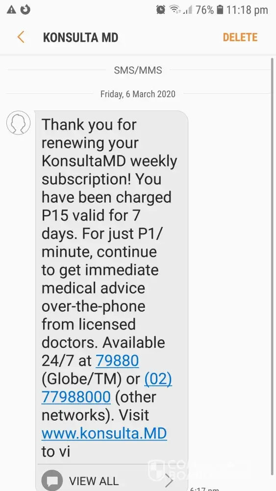 My mom is a senior 70 years old and have been complaining about her missing load for no reason. We called globe customer service to make sure she is not registered to any ad on features. Until I got hold of her phone tonight and read one or her messages one of which from Konsulta MD and she was deducted 15 pesos valid for 7 days. This Konsulta MD is ripping people off especially those seniors who has no idea how they came about subscribing to the service. They sent a text message but no option to UNSUBSCRIBE from the text message they sent. My poor unsuspecting senior mother out up with it for years now just to keep her phone number. I hope National Telecommunications company will take action against them and those victims will also come forward to end this injustice. My sister in law have the same problem and refused to put credit on her phone because this Konsulta MD would just take it. Unbelievable. How many thousands or millions of Globe subscriber pa naloloko nyo? Kahit 1M subsriber lng yun with 15.00 pesos "subscription" each month. Ang gagaling nyo!