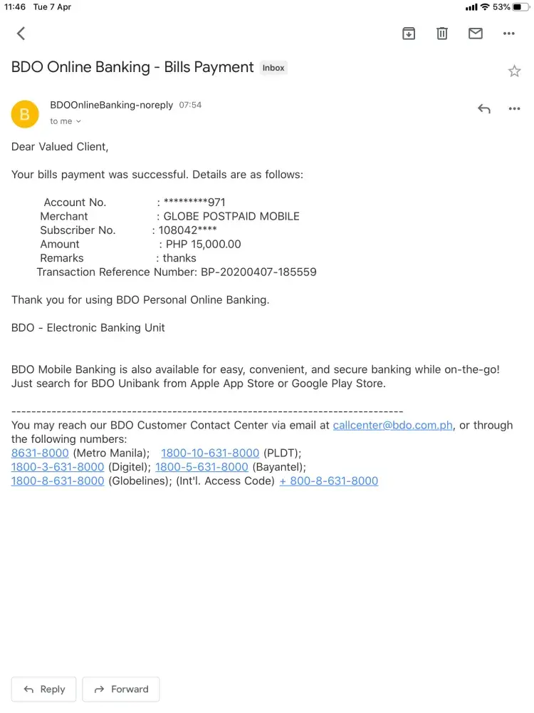 I have a complaint about today's transaction, someone used my BDO savings to pay Globe post paid account amounting 15, 000 pesos. My account was hacked and I already informed my bank. I would like to know if you received any payment from your post paid subscriber today morning via BDO transfer.