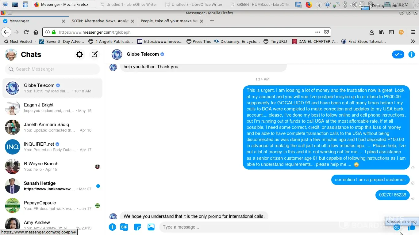 First I'm a senior age 81. Due to the lockdown I must depend on my Globe GOCALLIDD 99 prepaid service to resolve banking issues with BOA in the United States. During the month of May I have put a large (for me) sums of pesos and have not gotten the time of service for the funds paid. I'm requesting and audit of my account (63 927.016.6238) and to have a manager respond to me in https://www.messenger.com/t/globeph which has not happened.