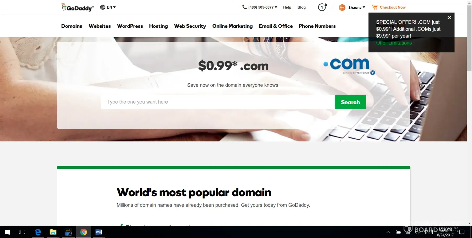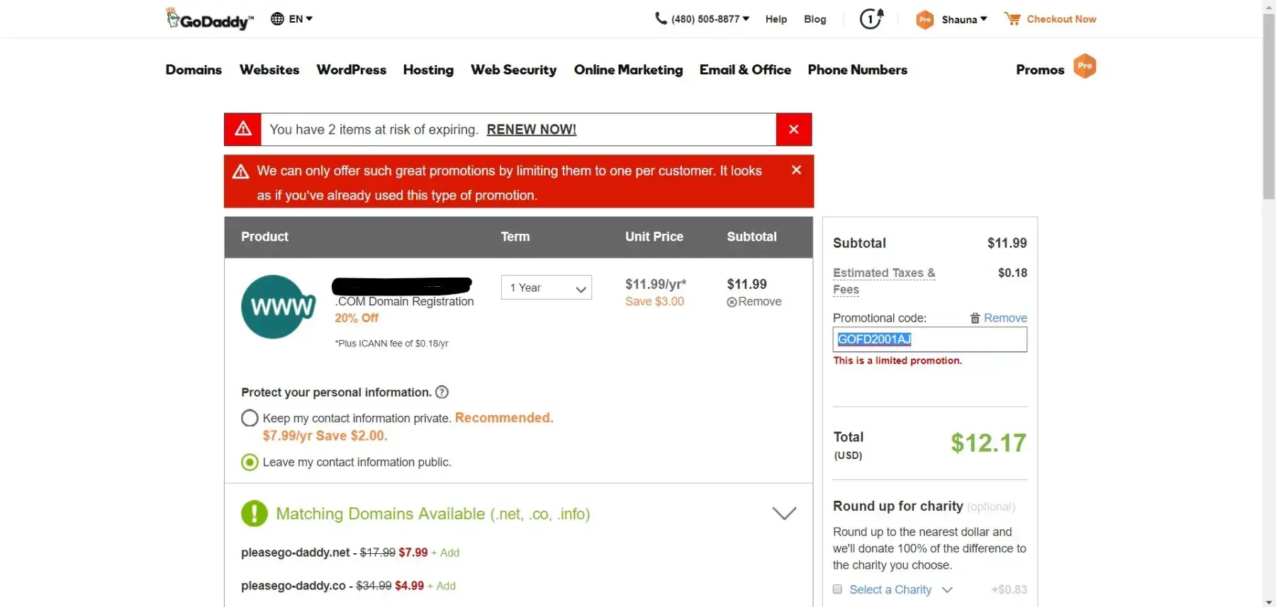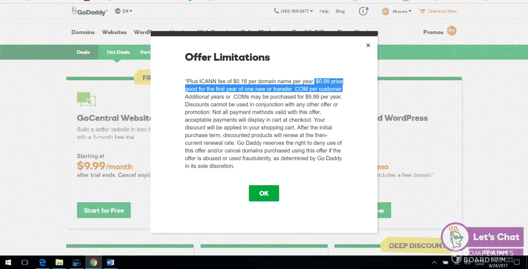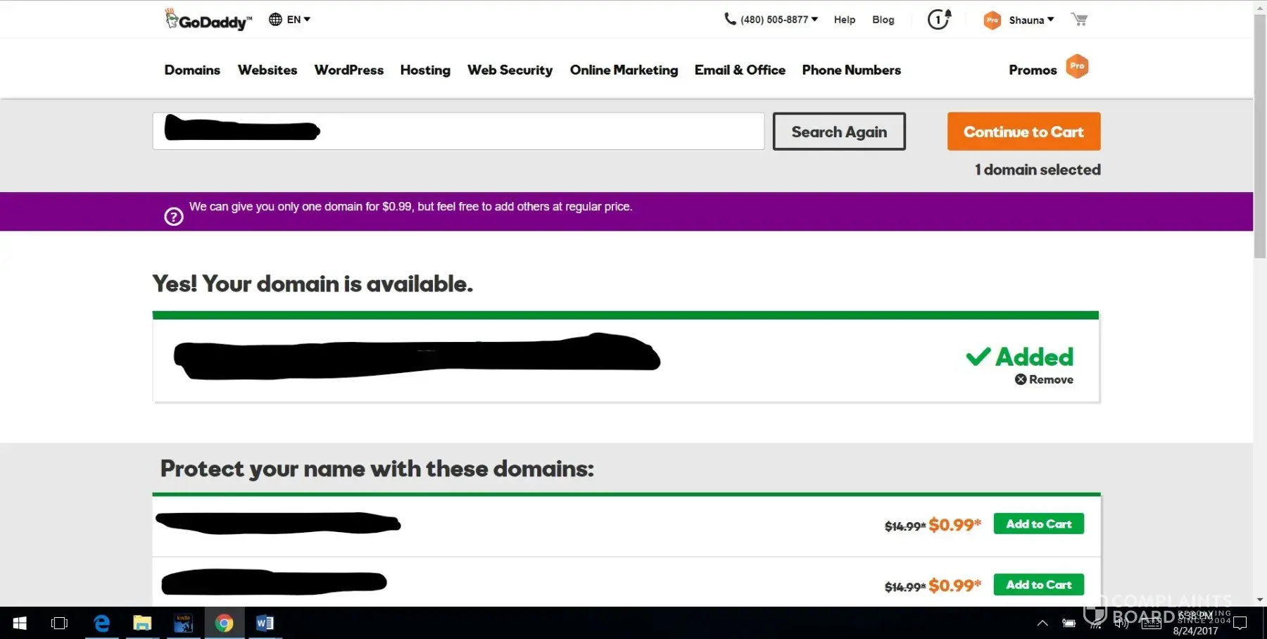 Is business really that bad GoDaddy that you feel you must resort to such tactics? Have you ever thought that it's because of such tactics that business is bad? The competition is winning and instead of deciding to treat your customers GOOD, you instead come up with more crafty ways to get their money? Not smart business with all the competition you have. I for one am transferring my 20+ domains that I have with GoDaddy elsewhere. But I'm not even done with what happened! Right after speaking with the GoDaddy reps Ray and Josh I again emptied my shopping cart and decided to go through the process of ordering one more time so I can take screen shots and have proof of their bait and switch tactics. When I searched for the domain name again, I got a DIFFERENT response. It said 'Congratulations, your name's available' but then instead of the" $0.99" part of the message, there was a completely different banner with a completely different message - THAT HAD AN ERROR IN IT. It said 'We can only give you one domain for $ .__, but you are welcome to buy more at regular price.' It was just plain 12 point font like the font of this complaint, and the DOLLAR AMOUNT WAS NOT THERE. I stared at it, then resubmitted my search, and got the same message, but this time the dollar amount was complete with $0.99! It was just like someone was changing the web page in that very moment! SCANDALOUS! But even the last message said "We can only give you one domain for $0.99..." SO GIVE IT TO ME! If the deal doesn't apply to me, it should have said "We CAN'T give you one domain for $0.99..." Not "we can." For any other business, the terms and conditions of promotions are written in so much detail and with such extensive legal jargon, their painful to read. GoDaddy say 'one per customer' and leaves yards of room for different interpretation, so they can say 'one per customer' means for life, where with every other business it means for the length of the sale - with DATES clearly given. Otherwise, it specifies "first-time buyers only." And what business changes their website WHILE a customer is disputing it's content? CLASS ACTION ANYONE?