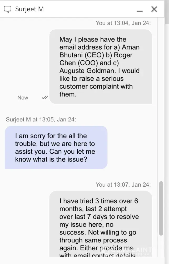Started another chat, Surjeet M, explained my problem, asked for executive contact details to complain. Was refused the contact details, told to message [protected]@godaddy.com but message bounced back, address non existing.