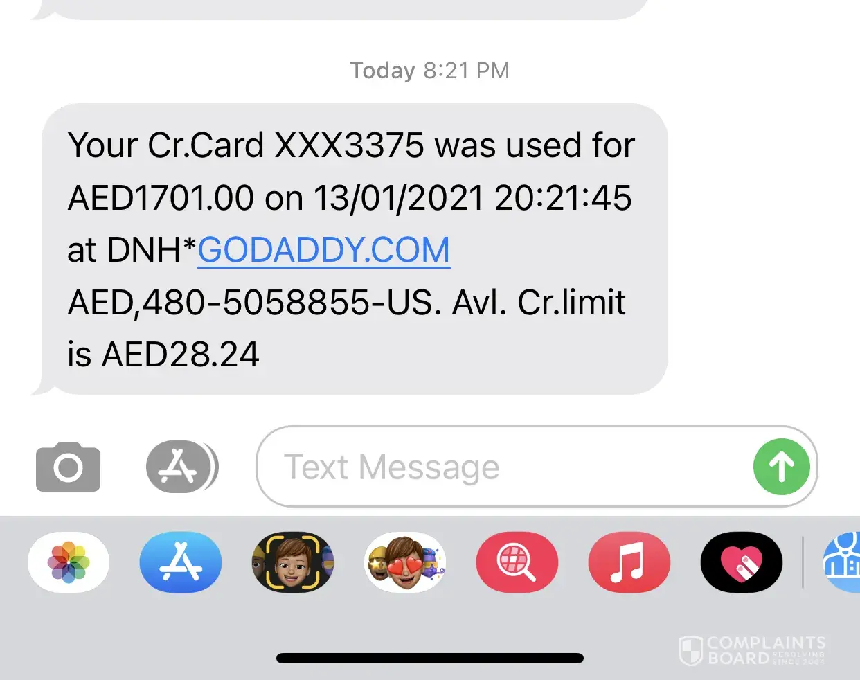 I have domain from go daddy from the last 3 years and I have been paying 226 AED (United Arab Emirates Dirhams) every year. Mostly they deduct directly from my credit card every year. But today they deducted 1701.00 AED from my credit card which is a fraudulent transaction and even I didn't use the website and I didn't get any other service from godaddy. So please clarify me and also revert my additional charges back to my account.