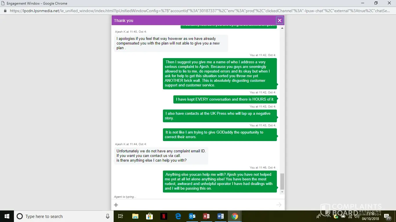 Then they forwarded my chat to some Ajesh K. Who is their supervisor as per them. He just shut the chat window on my face and left. What the *** I am supposed to do now. GoDaddy is just playing around with their customers' money.