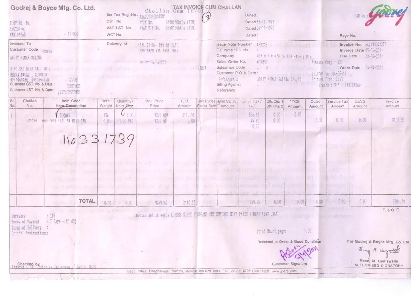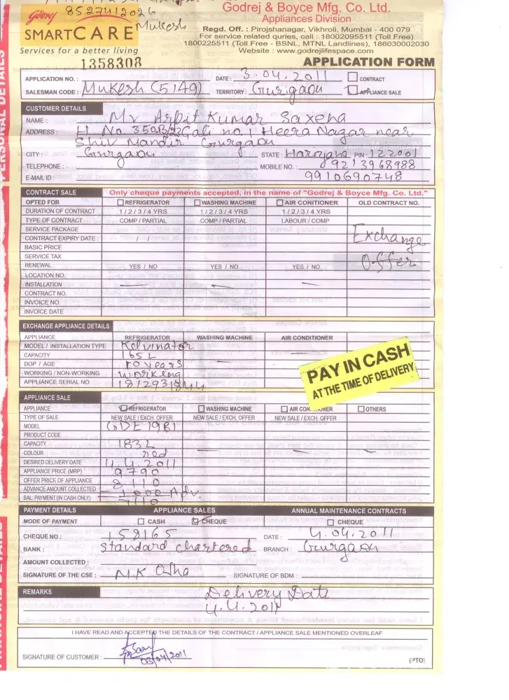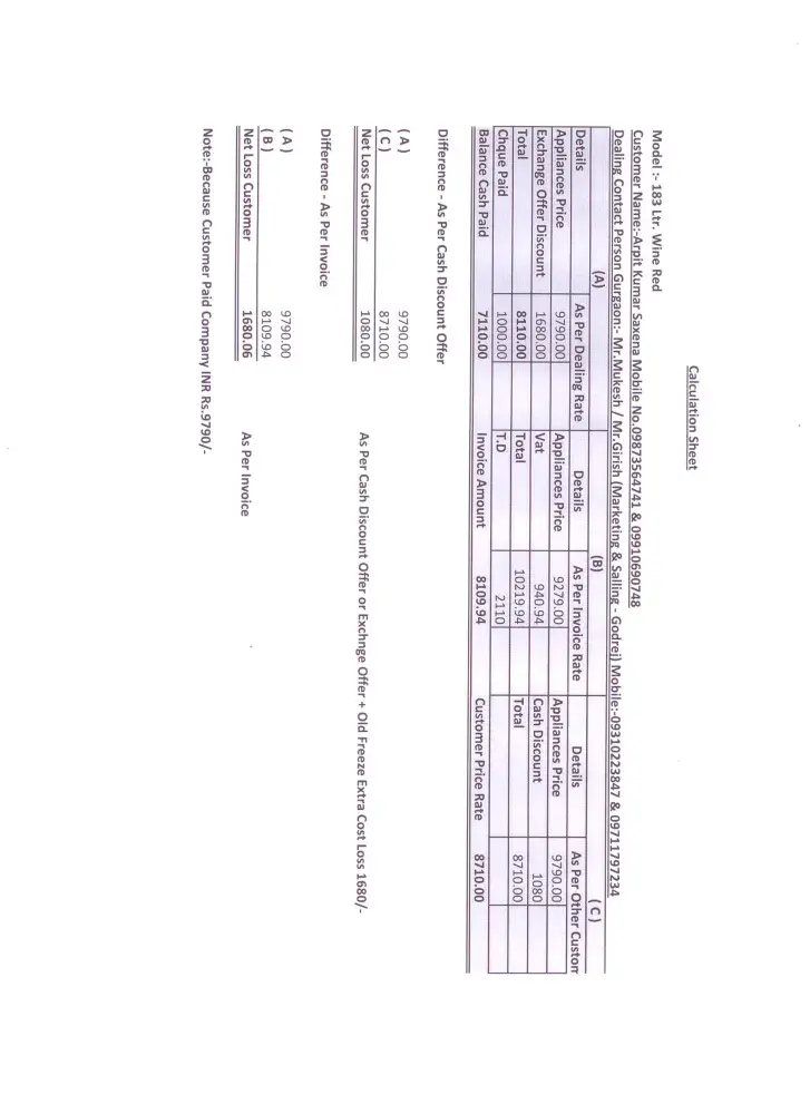 I am arpit saxena. I Purchase new frreze Godrej Company. Dealing Person Mr.Mukesh -[protected] & Mr.Girish -[protected]. Hide Actual Saling Price Offer Price Company after cash discount Rs.8710 for 183 Ltr. but Salling Person Sale by this Freeze Rs.9790/- + Old Freeze Exchnge Offer-Rs.1680/- but Invoice Show old Freeze cost Rs.600/- total Loss is 1080/- & 1680 /- old freeze cost.