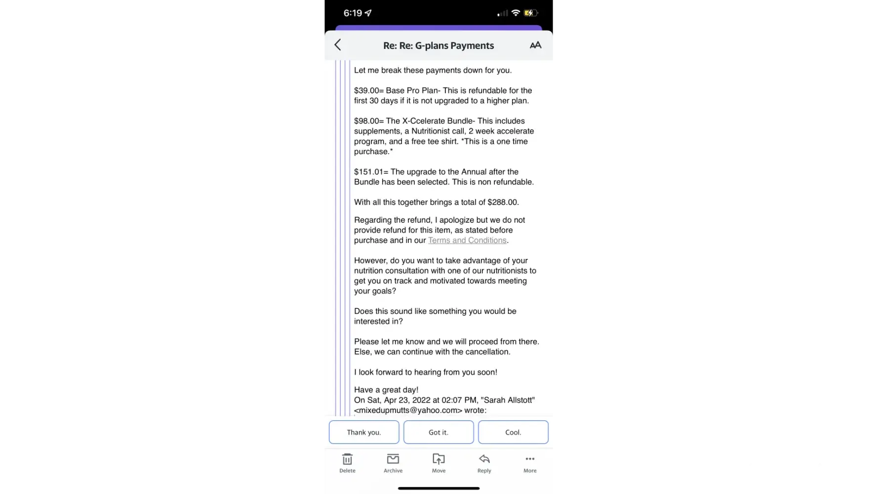 Desired outcome: Refund of $288.01