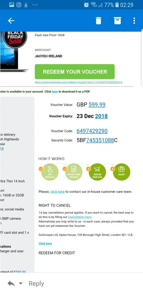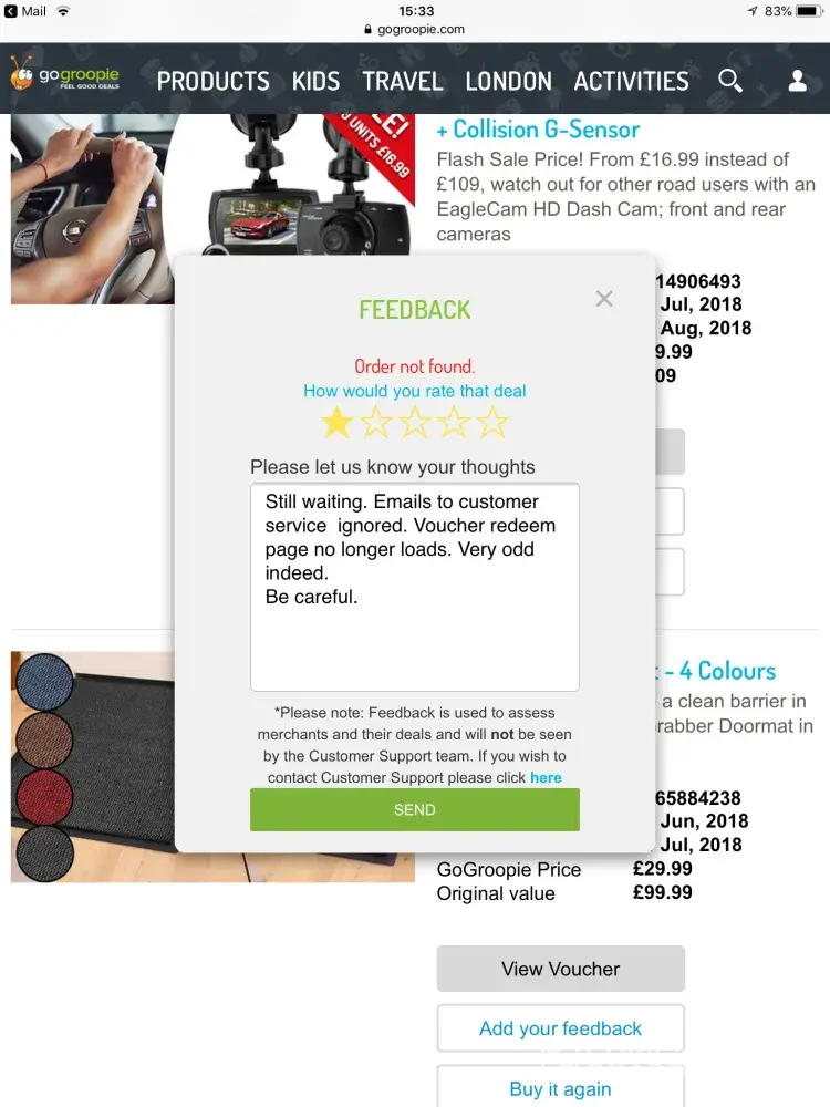 I ordered a laptop and cancelled the order along with my voucher now when I click into my orders nothing is showing up I can't even get my voucher code or anything my bank has been informed about this matter i tried contacting the merchant and gogroopie and have heard nothing back at this abosoutly shocking it's ament to be a secure account .. I would like to hear from any off you or I will be taking legal action towards gogroopie and the merchant as they have let people be scammed out off money ... I would like to hear from use asap...