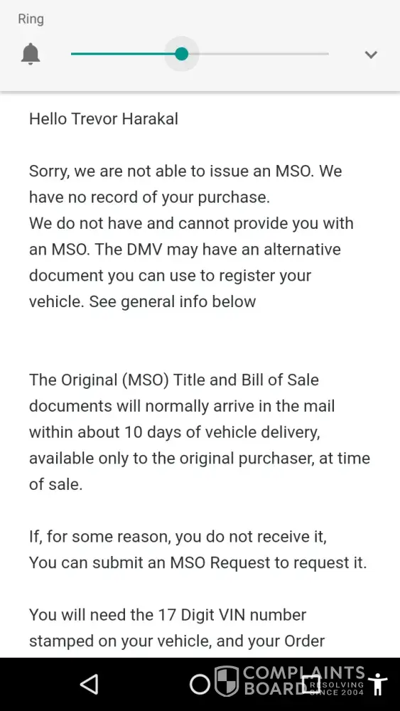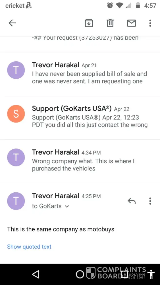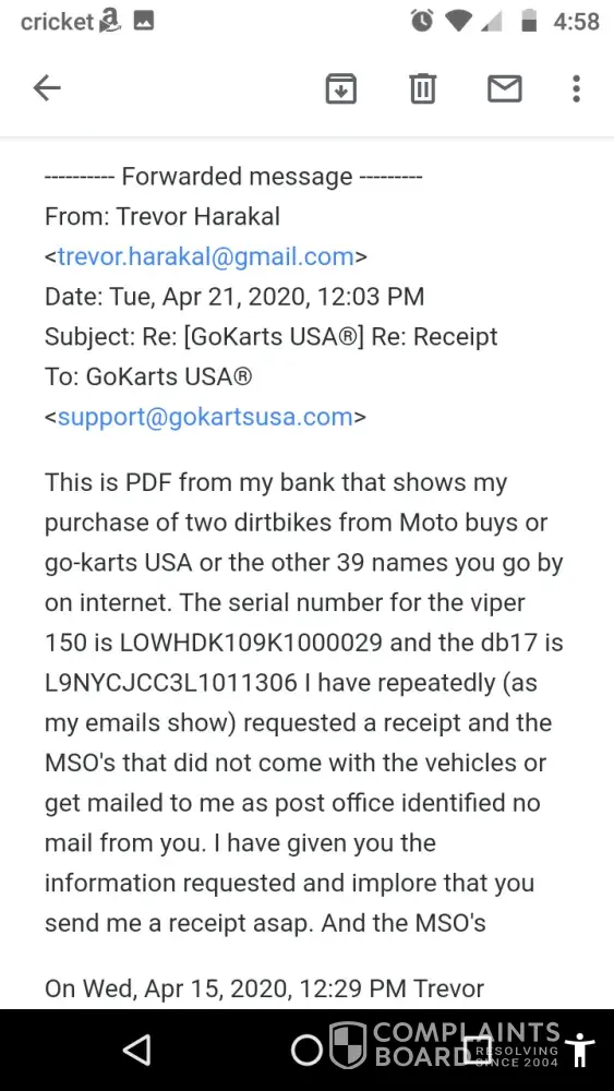 Go karts USA I called to purchase 2 vehicles. I have tried to get a receipt or bill of sales and MSO s they say were sent within 10 days. They were not as post office has no record. I got bank statement in which it says Moto buys this is the same company and crooked to hide behind many names to scam the people. I clearly called and placed a phone order with go-karts USA not Moto buys but they are the same and now telling me they have no record of sale when I have my bank statement that says almost 2,000 dollars was spent there on two dirtbikes. I want a bill of sale and mso never supplied.