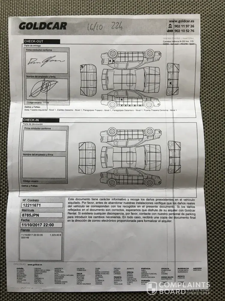 The car was booked to be returned at 5:30 and no one was serving out of hours, so I had to push the key through the letter box on the office door as I had a flight to catch. This means I had no signed check in document. Two days later I got email from Goldcar claiming I've done three scratches. One on bonnet which cost €250, one on front door €200 and one on rear door €200. Well, I've been parking in underground expensive car parks to avoid this as on street parking in Gran Canaria is worse than in London. Funny enough they did not find any of the damages which I had signed.