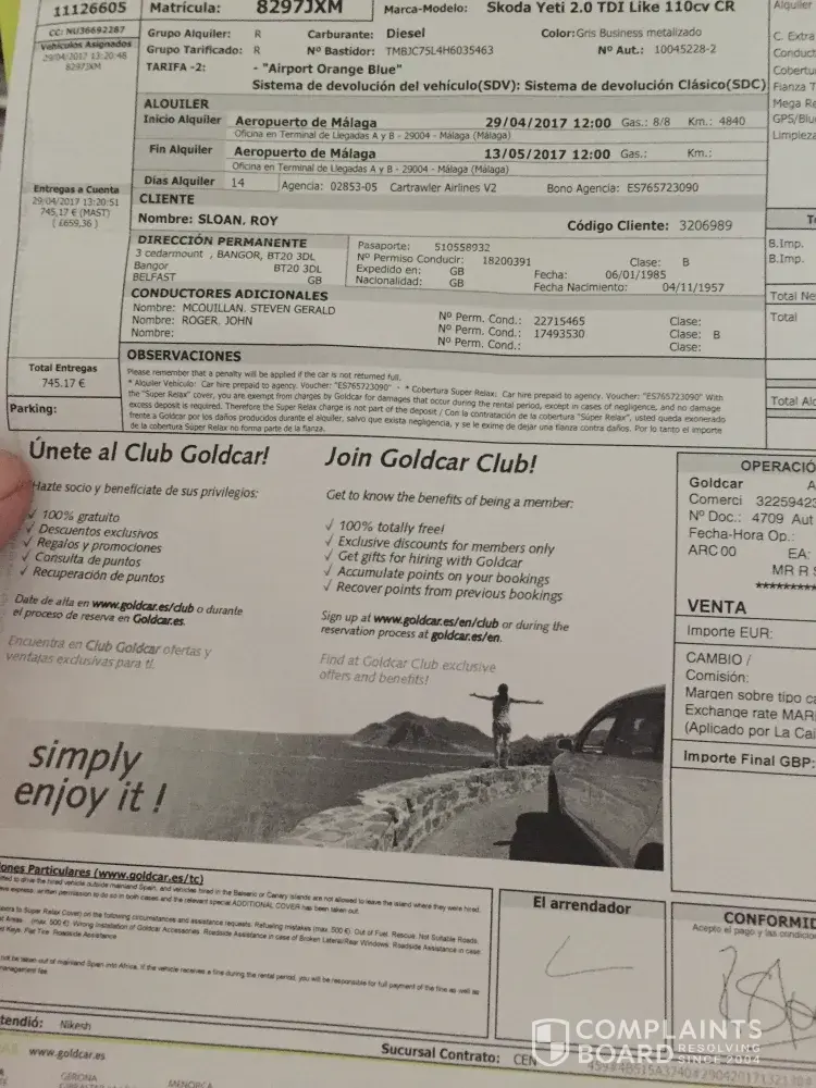 Good morning, we recently returned from Spain. Prior to our holiday we booked car hire through Gold Car for our ten day stay, receiving confirmation via email of our booking .