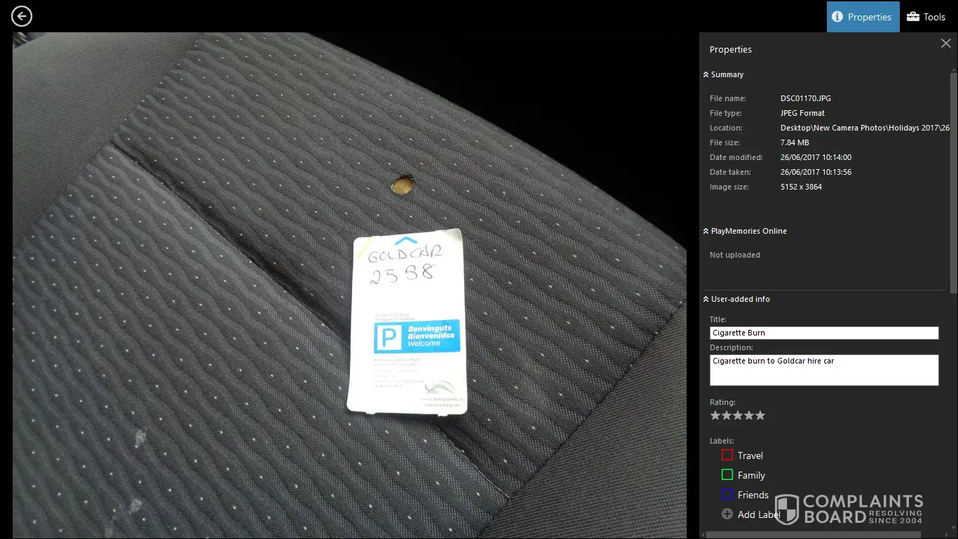 charged €1,500 for burn on passenger seat on vehicle at pick up (photographs proving same)