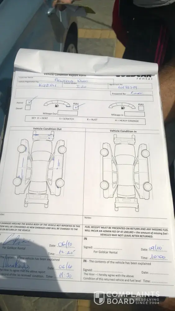 Once outside the terminal and ready to depart with the car, we checked the car and noticed 7 more damages that we not reported on the form handed to us inside the airport terminal. This checkout form was signed by the GoldCar staff member Dalia (please see attached form duly signed).