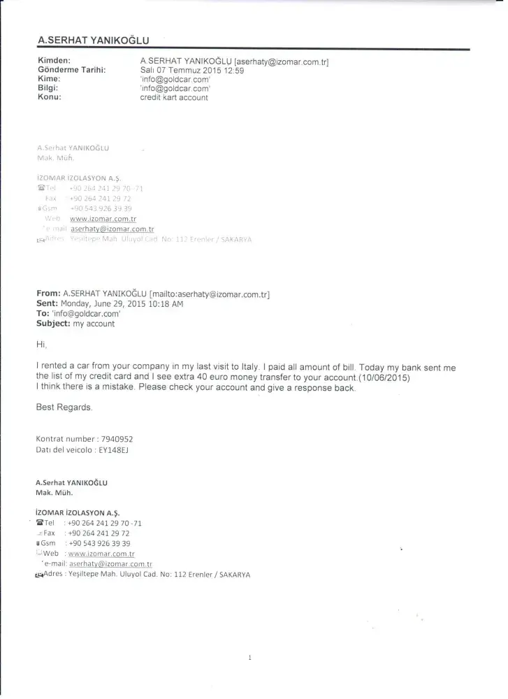 I rented a car in my last visit to Italy. I paid all amount of bill. after 3 month later. I see extra 40 euro money transfer to my credit cart. I sent three mail to the [protected]@goldcar.com. but nobody answer yet. Where can I complain this company.