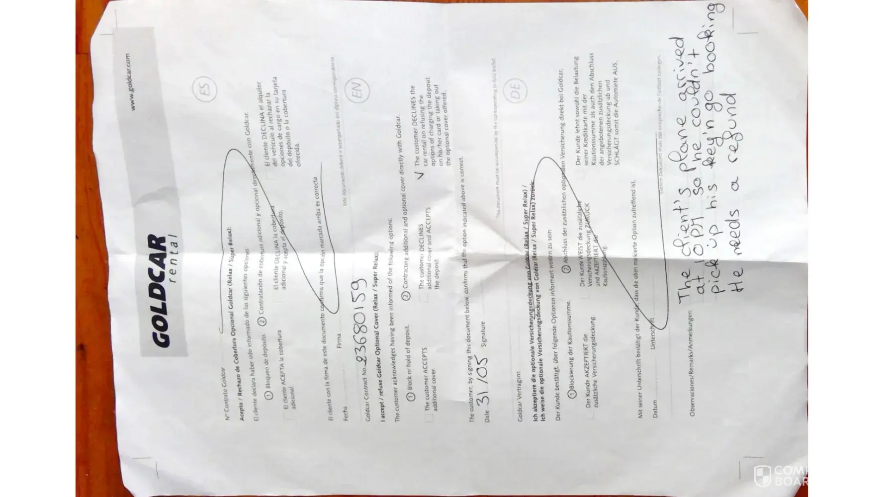 I then immediately phoned my son and asked him to phone Gold car staff at Murcia airport to tell then what had happened and that I am coming on a later flight that same day.